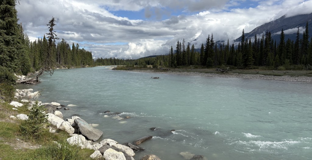 Glacier fed lakes and rivers have various tints, depending on the minerals released when the ice pack (glacier) on top of the mountain melts. This one is a very pretty turquoise color. As you can tell from the photos it was overcast this morning so the color of the water isn’t as rich as it would be if there was a bright blue sky overhead. Bow Lake is quite large. This is a little further up the road where there was a pullout for cars and tour buses to stop.