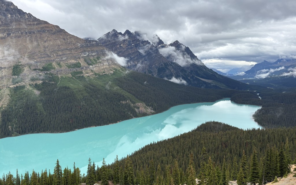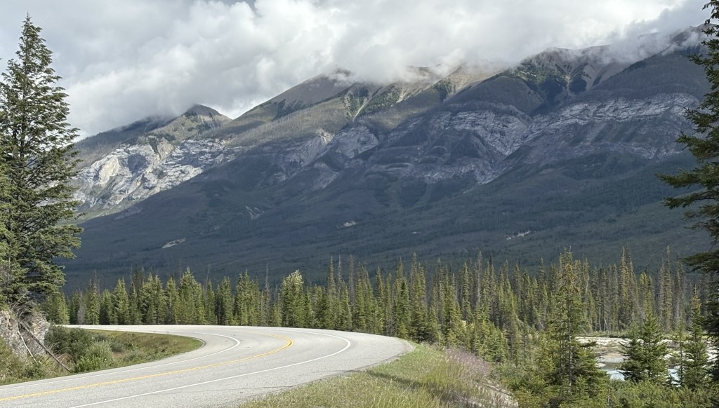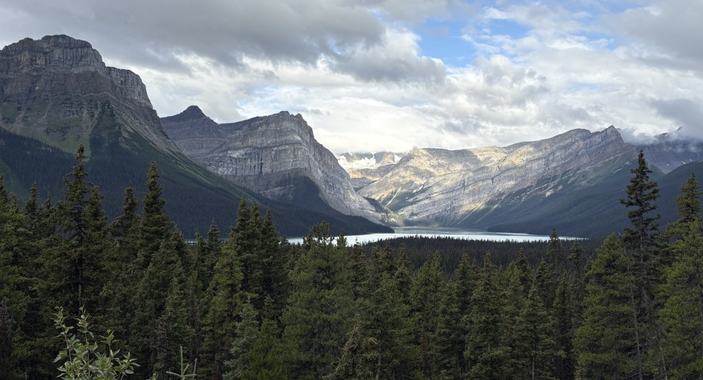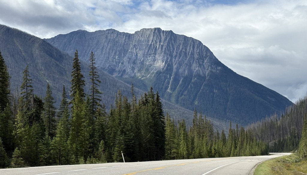 And a wider view looking back. These photos were all taken August 8, about a month ago as I actually post this. As you can see it was an overcast, albeit clear (air-wise) day. I drove through this same area a few days ago in slightly less ideal conditions due to wildfire smoke which is now being thrust into British Columbia and the Candian Rockies from other parts of Canada, and took more photos which, when it comes time to post them, will show a slightly different look.