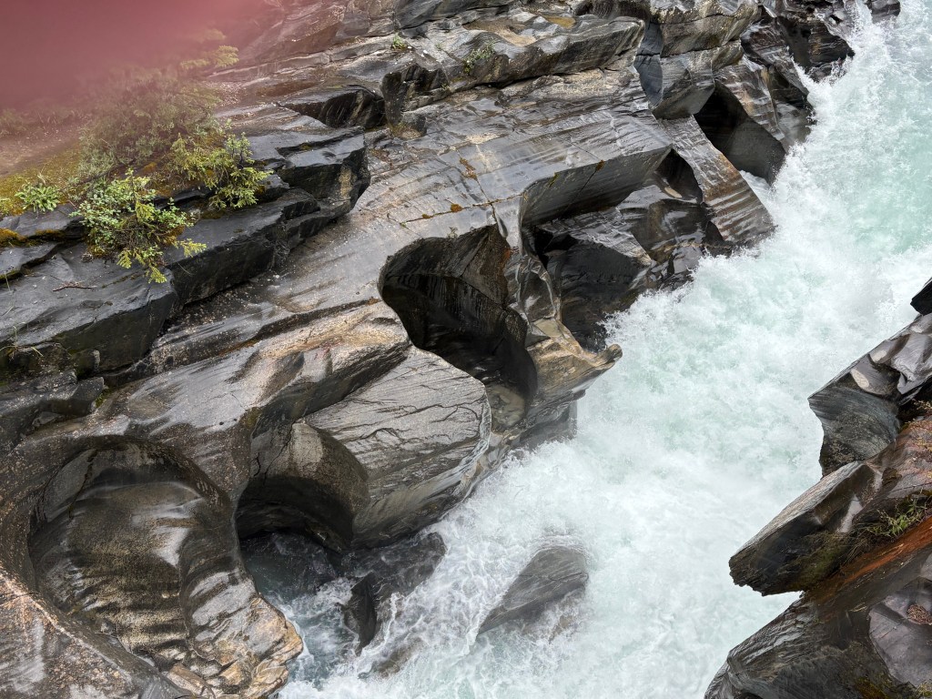 This is a small waterfall, Numa Falls, located near the north end of the Park. Not a very steep drop-off but time has worn some very curious patterns into the rock on either side of the water.