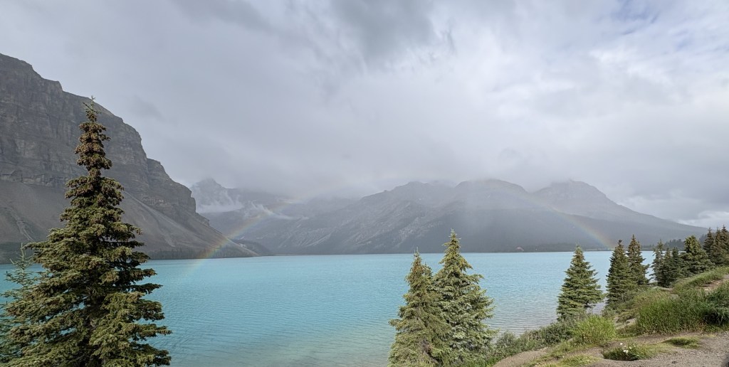 There was a sign indicating we were at 2,078 meters elevation (6,817 feet), the highest point on the Icefields Parkway. I presume they were talking about the roadway getting here, as we were still walking up a VERY steep, albeit paved, trail to get to a scenic viewpoint for the lake below. I was huffing and puffing, and exclaimed to another person walking near me that I didn’t expect to have to climb a mountain to see a lake. I found him when we got to the observation platform and told him it was SO worth it.