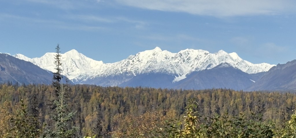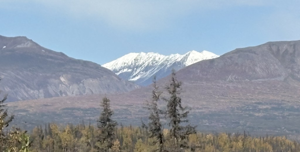 I had driven past the mountains I had seen earlier in the day and now, when I looked left (south), I could see tall mountains way off in the distance (behind lower hills and mountains in the foreground). I don’t really know for a fact but I believe I was seeing the tall mountains in Wrangell-St. Elias National Park. If that is true then I estimate they are about 180 air miles away.
