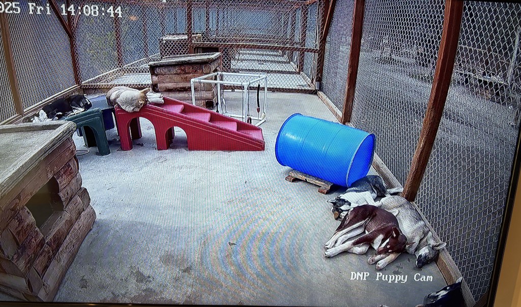 That is a view of the “Puppy Cam”. There were signs on Park Road which warned drivers to watch out for Sled Dogs which may be exercising along the road. As you can see, they were all zonked out in one of their enclosures and I never did see any out and about.