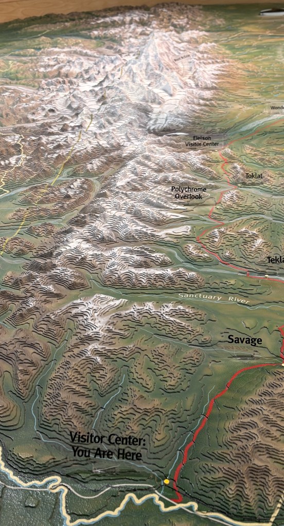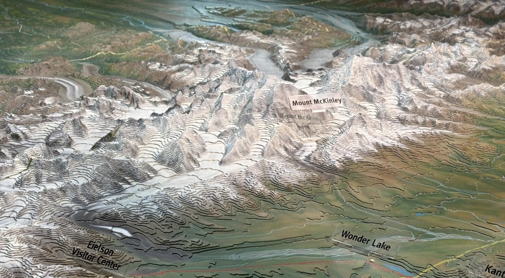 That is a 3-D relief map showing Mount Denali (aka Mt. McKinley) and it’s proximity to Wonder Lake. In the lower left hand corner you can also see a reference to the Eielson Visitor Center, located within the Park and only accessible by bus. I am at the Main Visitor Center out near Hwy 3.