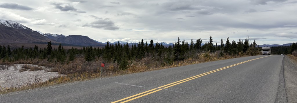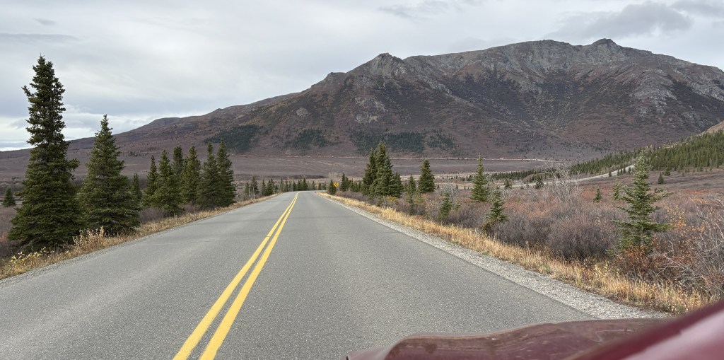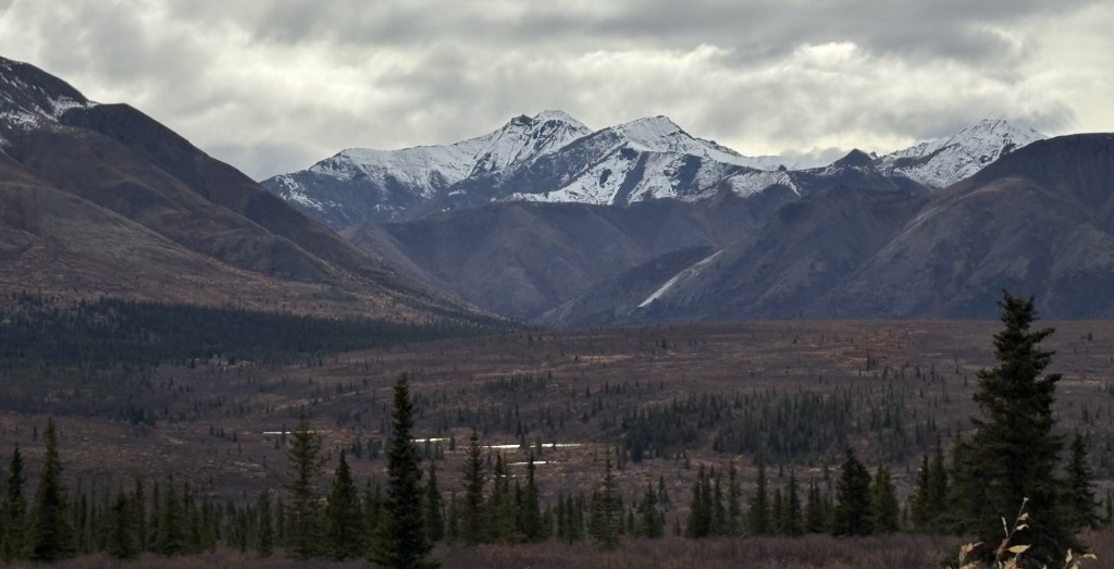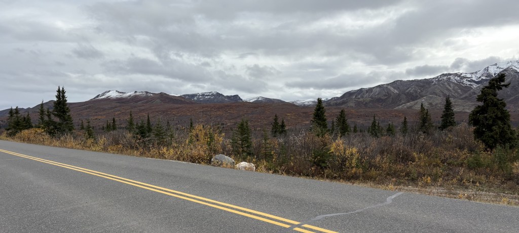 The mountains in the Alaska Range southwest of Mt. Foraker are further away from the highway so I never even got a glimpse of them as I drove north. The road had trees on the side in many places which blocked my view, and of course I was mainly focused on driving.