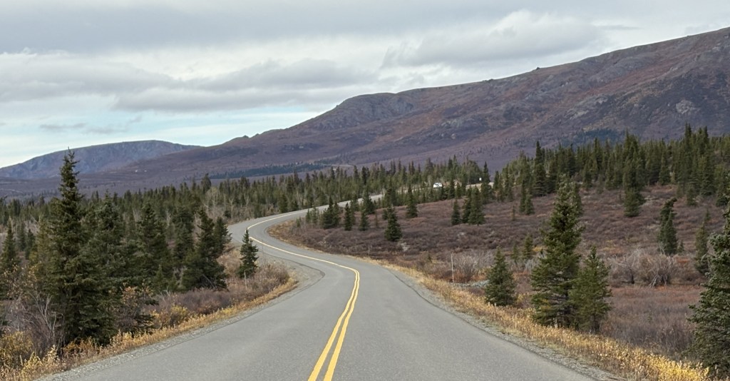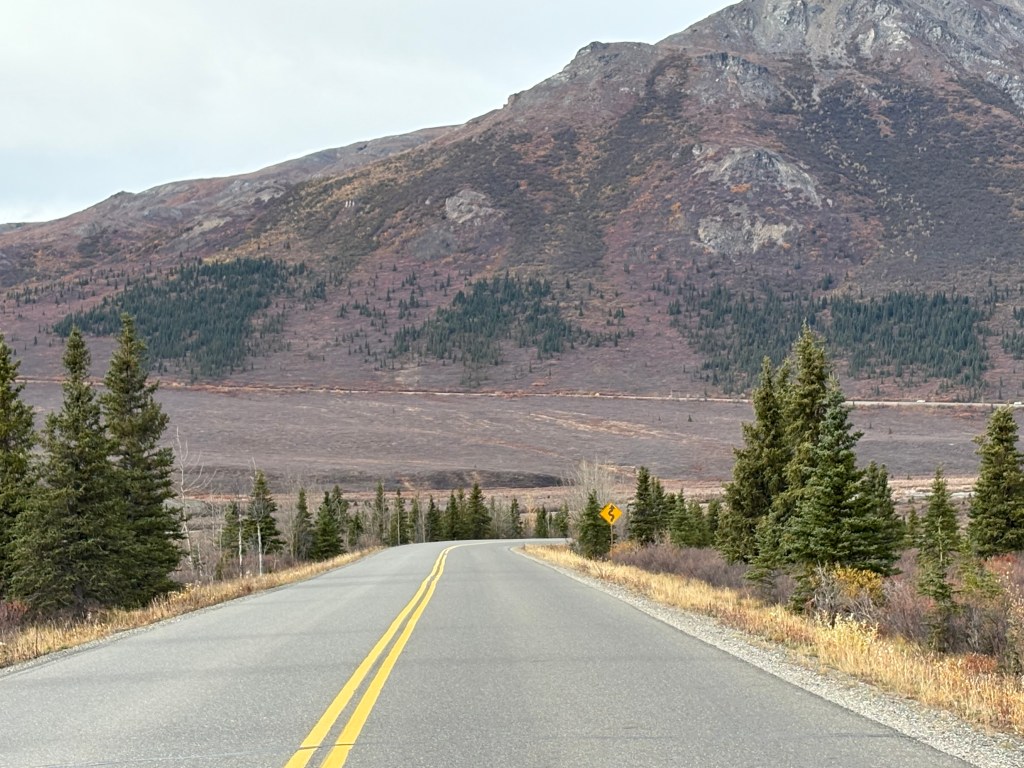 A small town fairly close to Anchorage (lower left corner of the map) is called Wasilla. From there north to Fairbanks is 316 driving miles on Hwy 3 and according to Google Maps takes 5 hours 22 minutes to drive. Coming down the east side of the loop, Fairbanks to Glennallen is in two parts – Fairbanks southeast to Delta Junction on Hwy 2, then Delta Junction south to Glennallen on Hwy 4. Total distance of those two parts is 247 miles and drive time is 4 hours 20 minutes. Then from Glennallen roughly west to Wasilla is on Hwy 1. Distance is 148 miles and drive time is 2 hours 38 minutes.