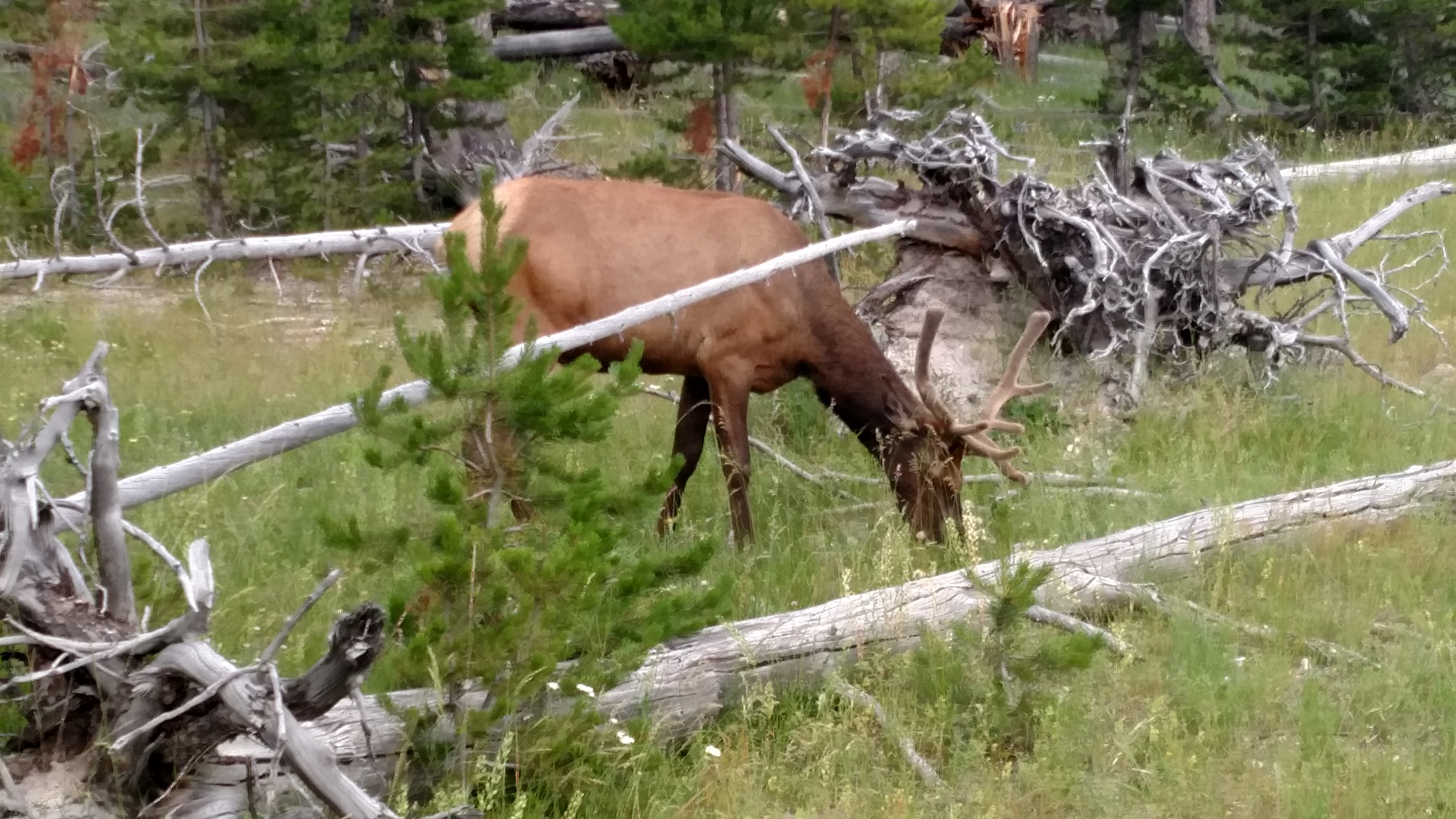 In addition to seeing many more bison I saw lots of moose today. This was the only male, and was grazing right next to the road late in the afternoon. I was hoping he’d raise his head a little more but then a ranger yelled at me for being too close (“but it’s for my blog peeps, ma’am….”) so I had to back away.