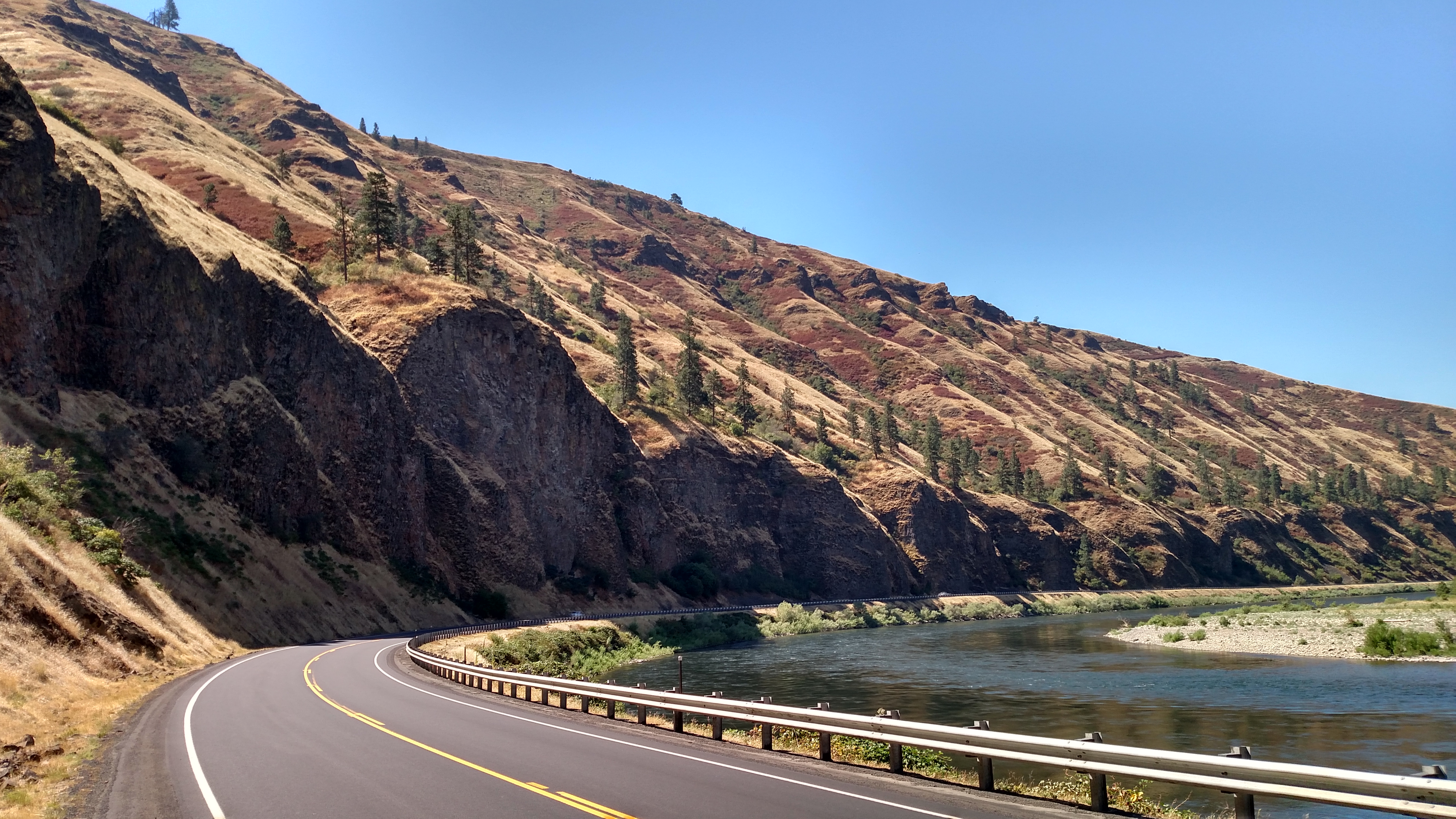 Today was another high mileage day. I made a big, counterclockwise loop from Coeur d”Alene south to Lewiston, then west to Lolo, Montana (just south of Missoula) and then the dreaded interstate back to CDA. The road I was on when I got to Lewiston was quite a bit higher than the town below. The roadway you see in the lower right is a portion of another road which descends to town from where this picture was taken. I stayed on the main road (behind me as I took this) which then went a little further south, then took an exit and started heading east on Highway 12.