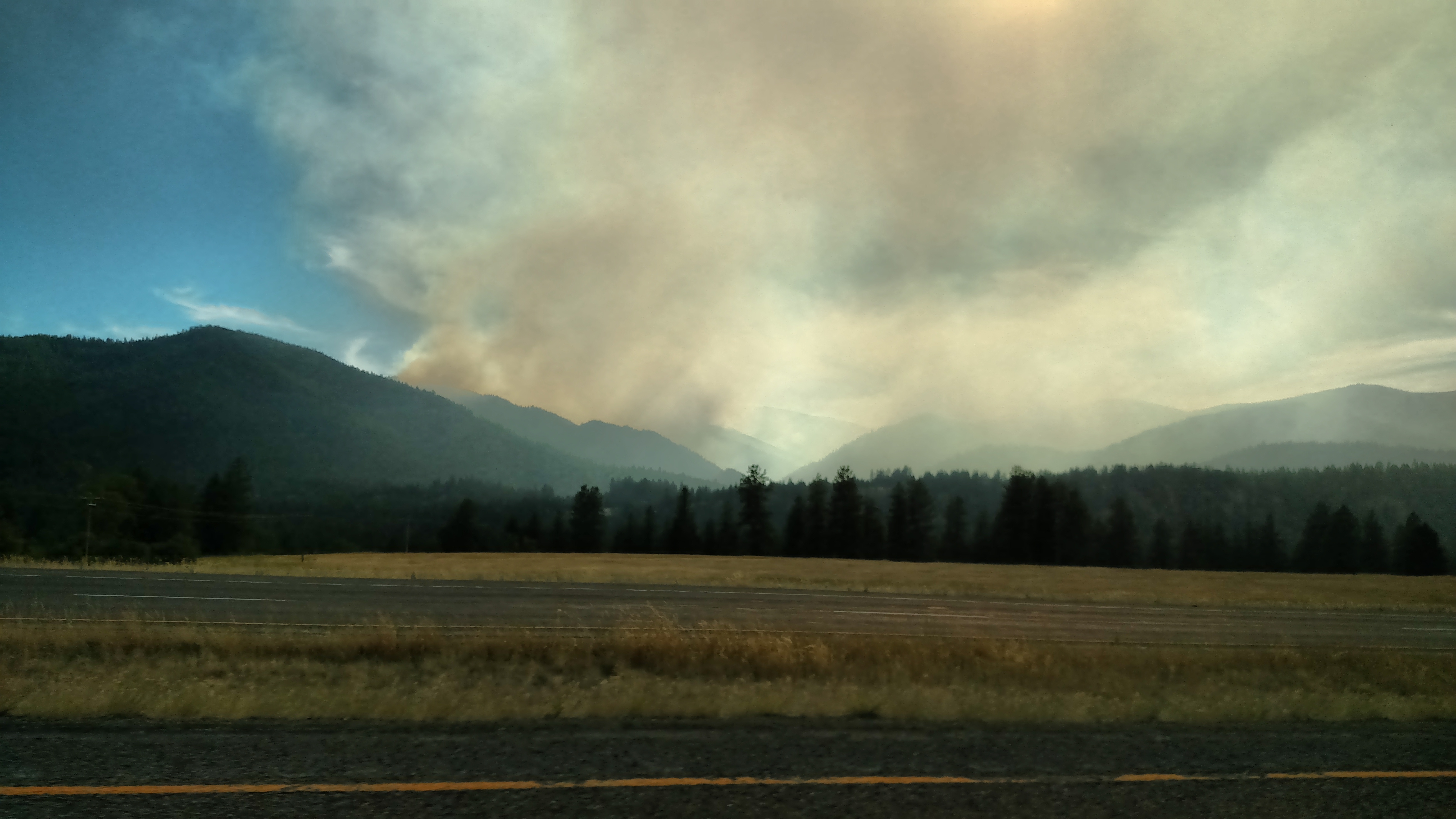 As I was ending my journey today I got on the dreaded interstate in Missoula to drive the 2 1/2 hours back to Coeur d’Alene. Once I got outside of town I could see a big smoke plume drifting north, away from the fire source. This was taken about 55 miles northwest of Missoula, looking south. Once I got a little further up the road I could tell that the fire itself was, thankfully, in an area of only maybe 4 square miles, and much smaller than what you often hear about on the news. I later saw about a half dozen helicopters parked in a field just off the interstate with fuel trucks and personnel nearby. The weather forecast this morning called for a front to come in about the same time as I took this and bring stronger winds overnight, which would be unfavorable for fire suppression.
