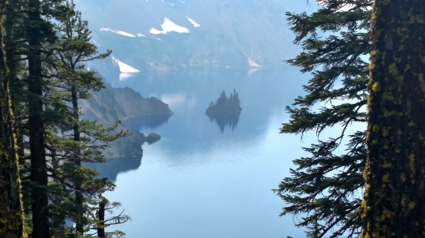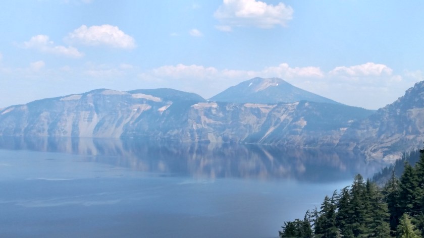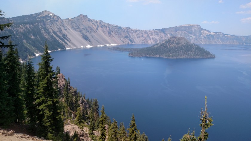 I will refer to various landmarks by clockface positions. I entered the Park via the south entrance but that actually put me at about 7 o’clock on the map. I traveled Rim Drive in a clockwise direction. I planned my arrival so that I would have the sun behind me as I was on the south and west sides of the lake. Because of the haze looking across the lake I am planning to come back early in the morning on Thursday and revisit the north and east sides of the lake for better pictures of the opposite banks. Because of the terrain there are not as many overlooks on the east side as there are on other parts of the lake.