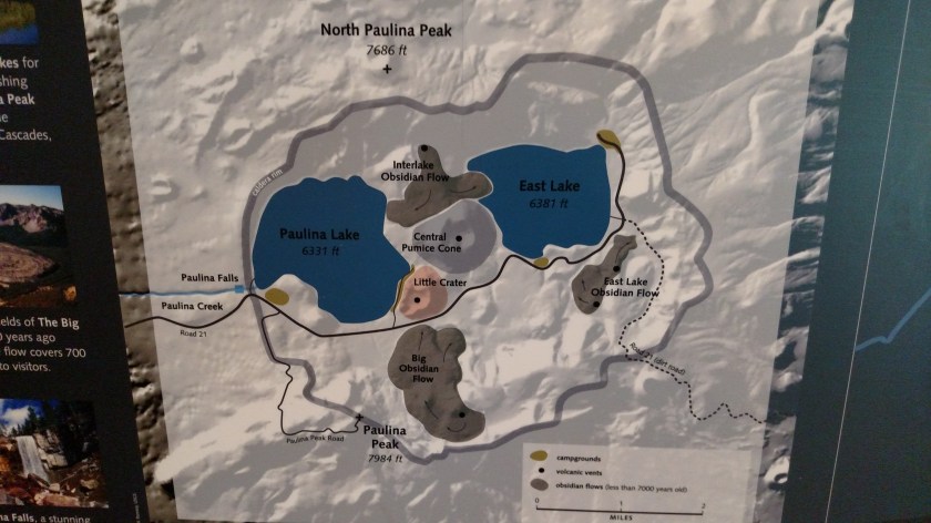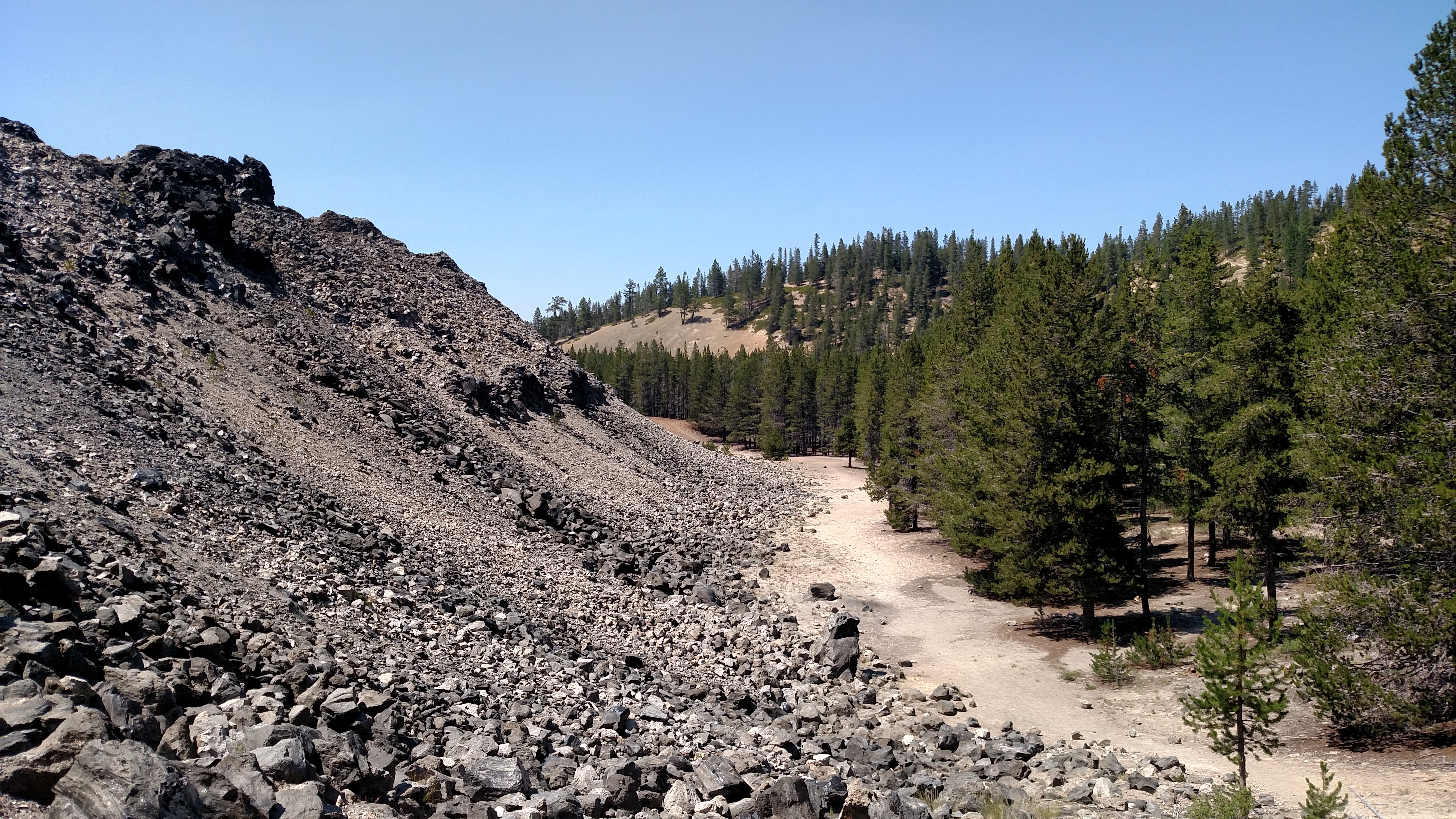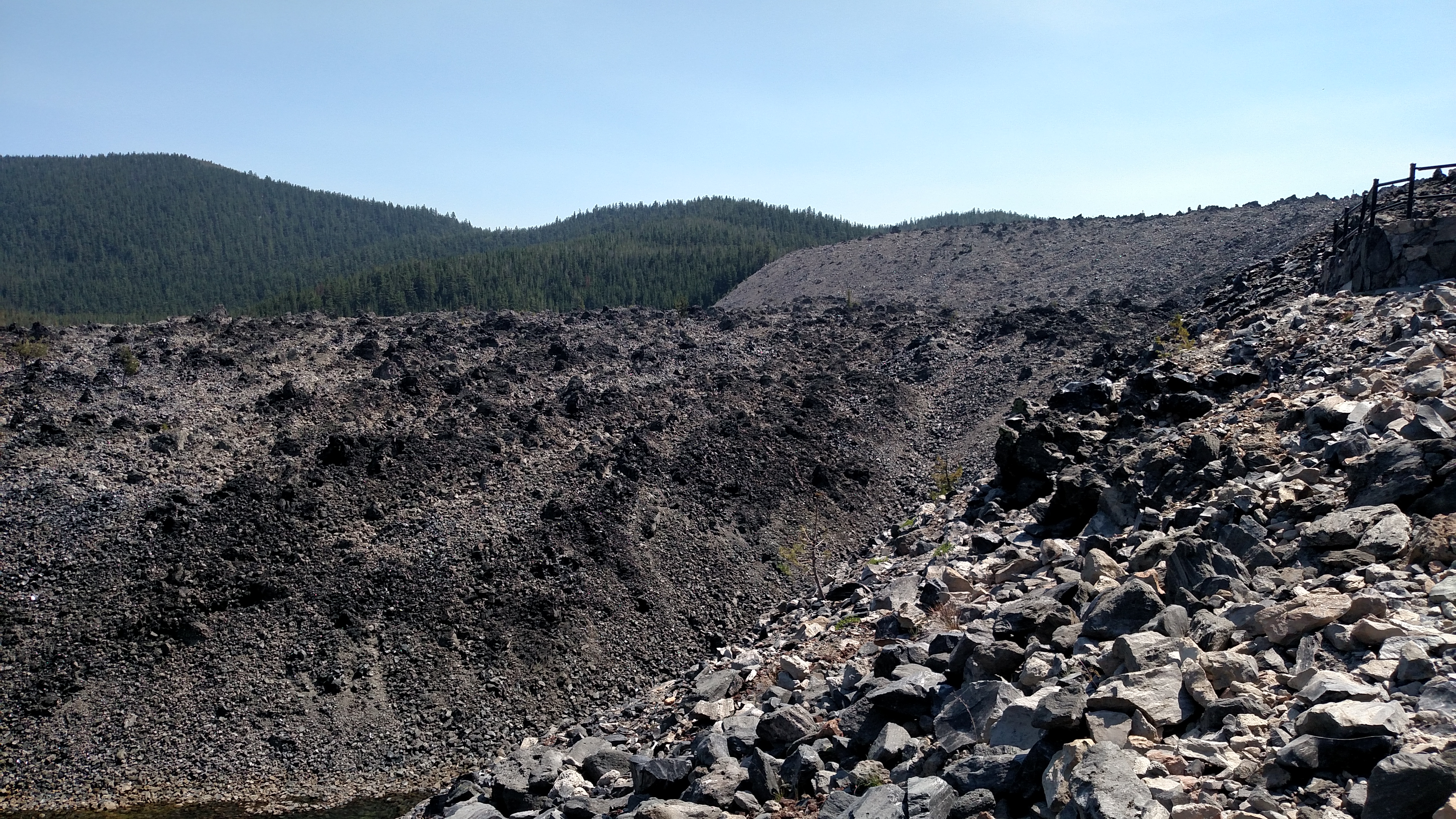These photos show a very small portion of the 700+ acre Big Obsidian Flow. These shiny black rocks (actually very dark glass) were formed when lava flowing from the volcano hardened as it cooled. As you can see by the top photo, the Flow is very tall, rising high above the mature trees.