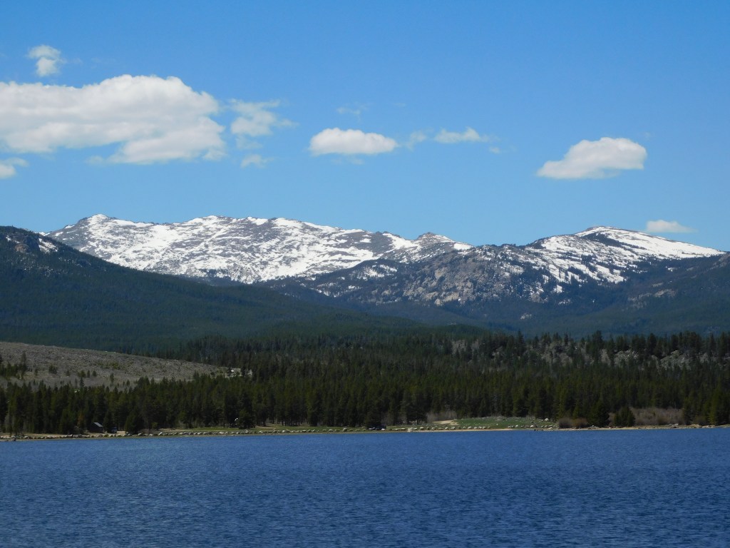 The paved road then started to descend a short ways before climbing again to where there was a beautiful lake, with the snow-covered Wind River mountain range in the background:
