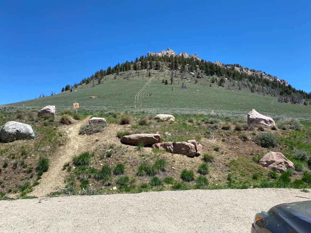 I soon crested top of road over this mountain and was in a parking area looking up at the back of the aforementioned rock formation. I was now at 8,442 feet: