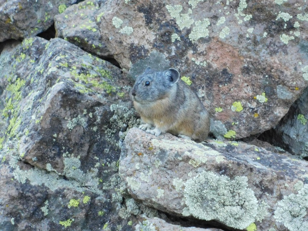 The pika is a small, rabbit-like animal about the size of a chipmunk. They are VERY sensitive to temperature and can die when temps get in the upper 70’s! For this reason they are found only at high altitude, and their numbers are dwindling as the worldwide temperature trend continues to rise. They are all but extinct in California now, where heat from wildfires further complicates things.