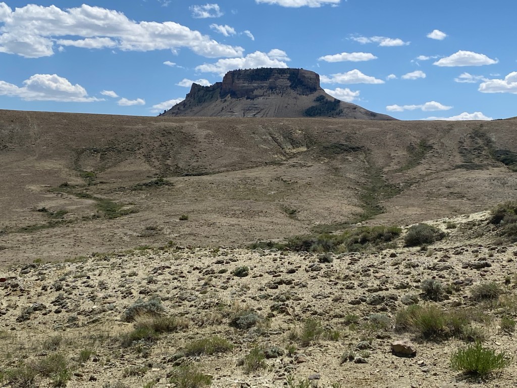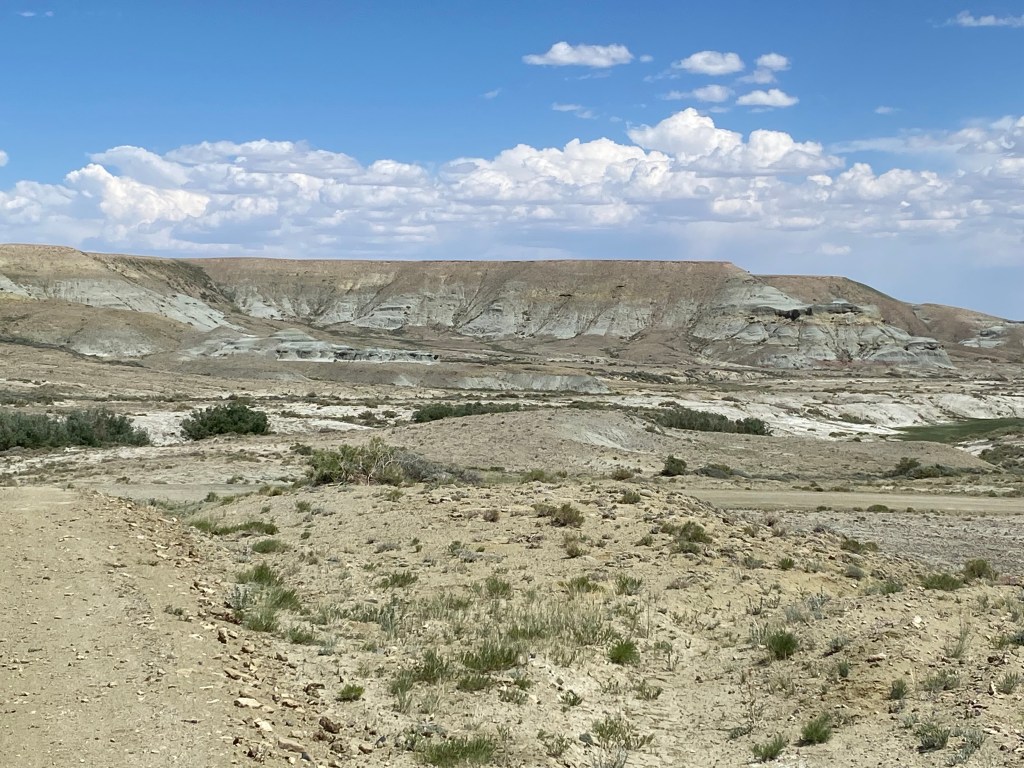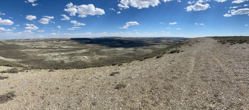 We had driven along two “rough” borders of the Red Desert when we drove down to Flaming Gorge National Recreation Area – southwest on Route 28 between Atlantic City and Farson, and Route 191 South from Farson to Rock Springs. We drove in on a rough gravel road, which quickly became dirt and rock, and were transported into a vast open area with… “not much”. There were some elevation changes and several buttes and other formations sticking up from the otherwise seemingly flat surface. It was hot, dry and isolated – just what you’d expect a desert to be. I checked my altitude app periodically and while I don’t recall the exact numbers it seems like we were always up pretty high – 6,500 or more feet.