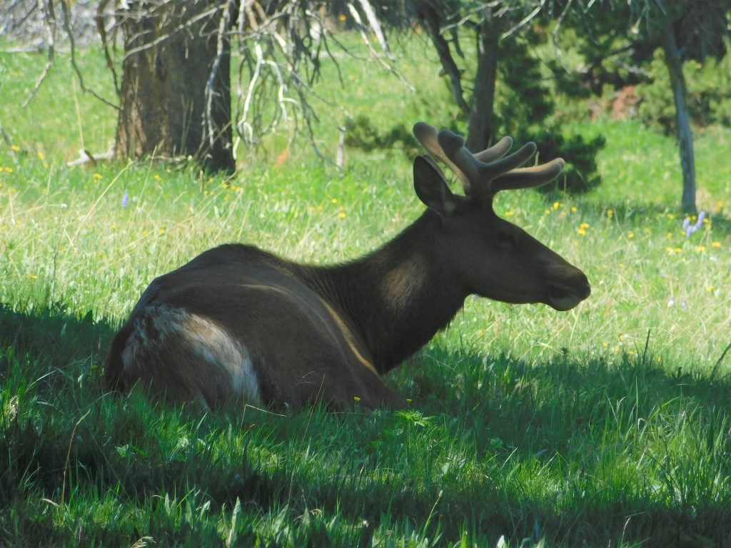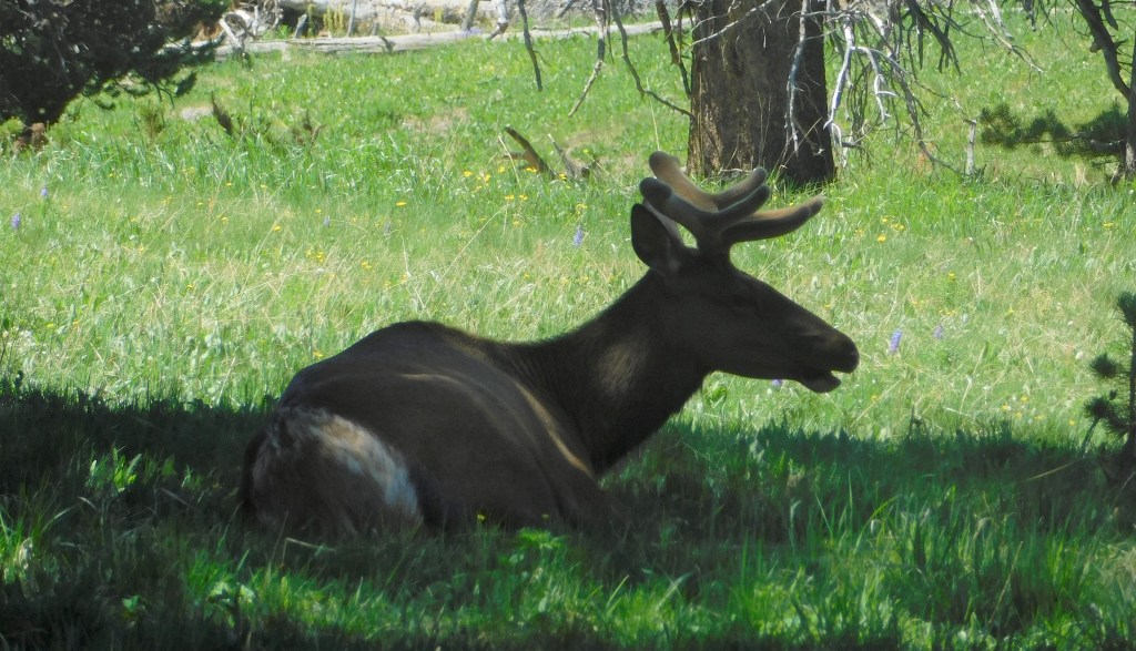 My goal was to continue north to Canyon Village and, from there, hike the short distance to a magnificent waterfall which I had been too lazy to hike to before. Unfortunately my plan was soon thwarted by traffic coming to a halt behind a seemingly miles long line of vehicles. This had happened to me in this same area before, 4 years ago, when a huge herd of bison crossed Route 20 bringing traffic to a standstill. Rangers were there to ensure than tourists didn’t get too close or harass the bison in any way. They basically let the bison do whatever the bison want to do (since this is their domain, after all) so there was no telling how long this stoppage might last. I only had a limited time so I finally decided to turn around and retreat. As I was driving south on Route 20 I saw some vehicles stopped and people out walking around so I figured it must be an animal sighting. Sure enough, this young bull elk was resting in the shade just off the road: