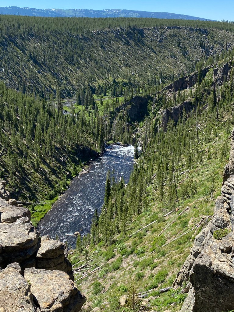 I continued driving north up to the entrance to Yellowstone. For a while after entering the Park the road runs alongside the Snake River, then the Lewis River. This is a deep gorge down to the Lewis River located just off the highway: