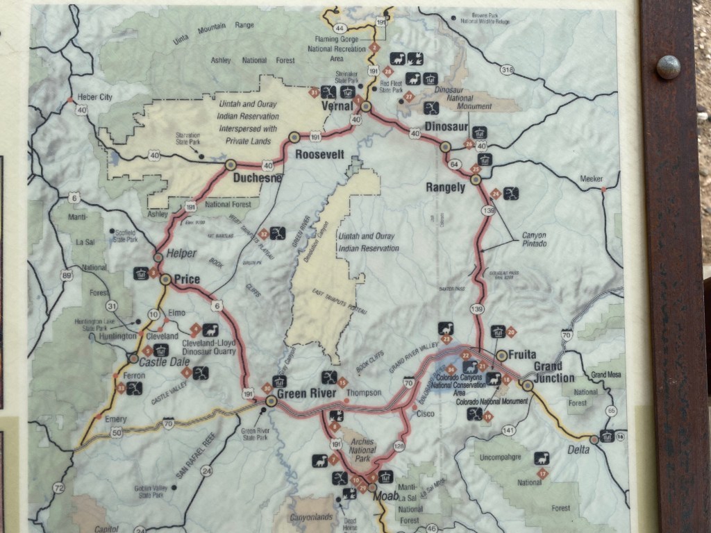 After driving past Flaming Gorge National Recreation Area on Thursday I continued south towards my ultimate destination of Grand Junction, Colorado. The morning was progressing very nicely until I hit a deer as I was driving southeast towards the Colorado state line. I was on a 2-lane highway and I saw a young deer charging the road from my left. The highway was slightly elevated so there was nowhere to pull off to avoid a collision. The deer saw my car and started to change direction but it was too late and I ran over it’s legs. I saw a truck in the other lane swerve to avoid the carcass and I continued driving. There was an area to pull off the road a short distance ahead and I stopped there to assess the damage. It appeared to be light and I decided to go back to the town of Vernal, which I had passed through earlier, to make sure the car ran normally rather than continuing on over 100 miles through a rather sparsely populated area where cell phone service might not be too good if there were problems.