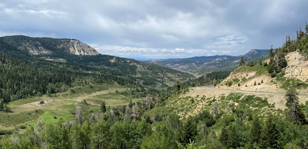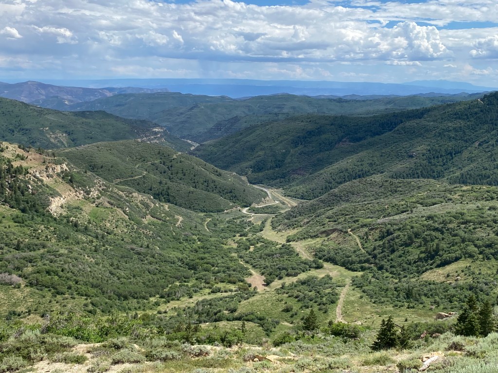 But when I reached Colorado things got a little greener, especially as I crossed through Douglas Pass, up at about 8,300 feet elevation. This was the view near the top looking back the way I had just come: