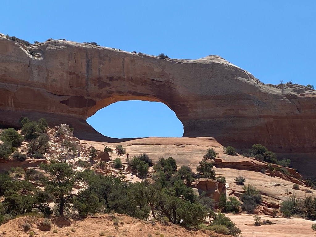 From the entrance to Arches I drove south, through the town of Moab and would continue about 40 miles. I passed another arch, Wilson Arch, along the way, just off the highway to my left. To give you some idea of the size, there are people standing down near the trees just below the open area under the arch.
