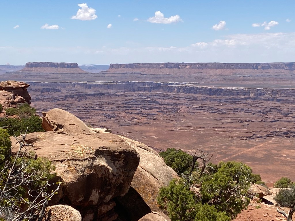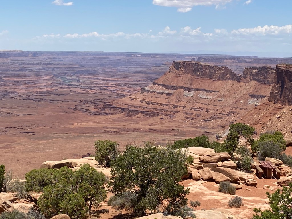 As you can see, it is a huge, rugged rock and dirt area virtually devoid of trees. There are two rivers which come down from the north (right), the Colorado and the Green, and they meet in the southern part of the Park before continuing (as the Colorado) down to Lake Powell in Arizona. As you may be aware from news reports, the river levels are dreadfully low this year and Lake Powell is so low that authorities are hard-pressed to use the water for power generation.