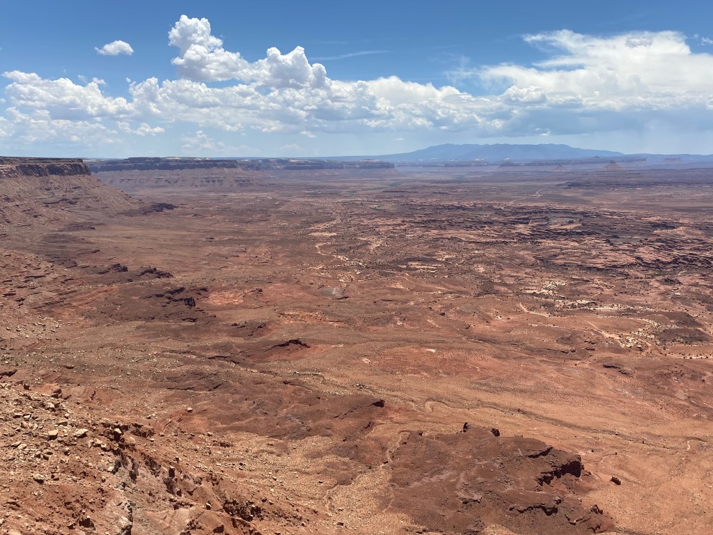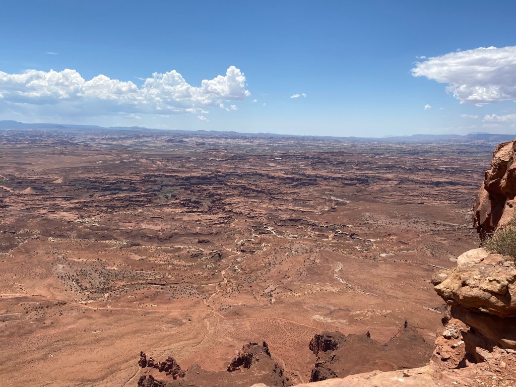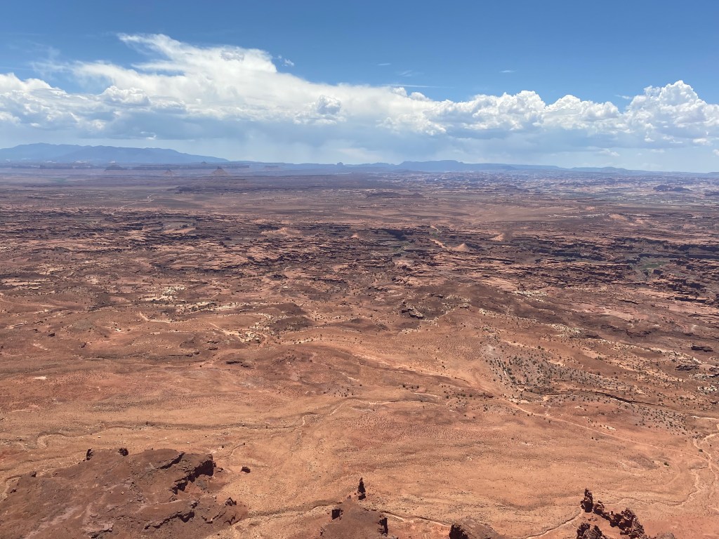 According to the map legend, looking straight out from the overlook it is about 5 miles to get to the eastern Canyonlands Park border, then another 12 or 13 miles to get to the other side. It is about the same distance if you swing the ruler down to the southern end of the Park (past the “Needles”). There are very few roads out into Canyonlands (one the reasons it hasn’t been a priority for me) and it is best seen on foot.