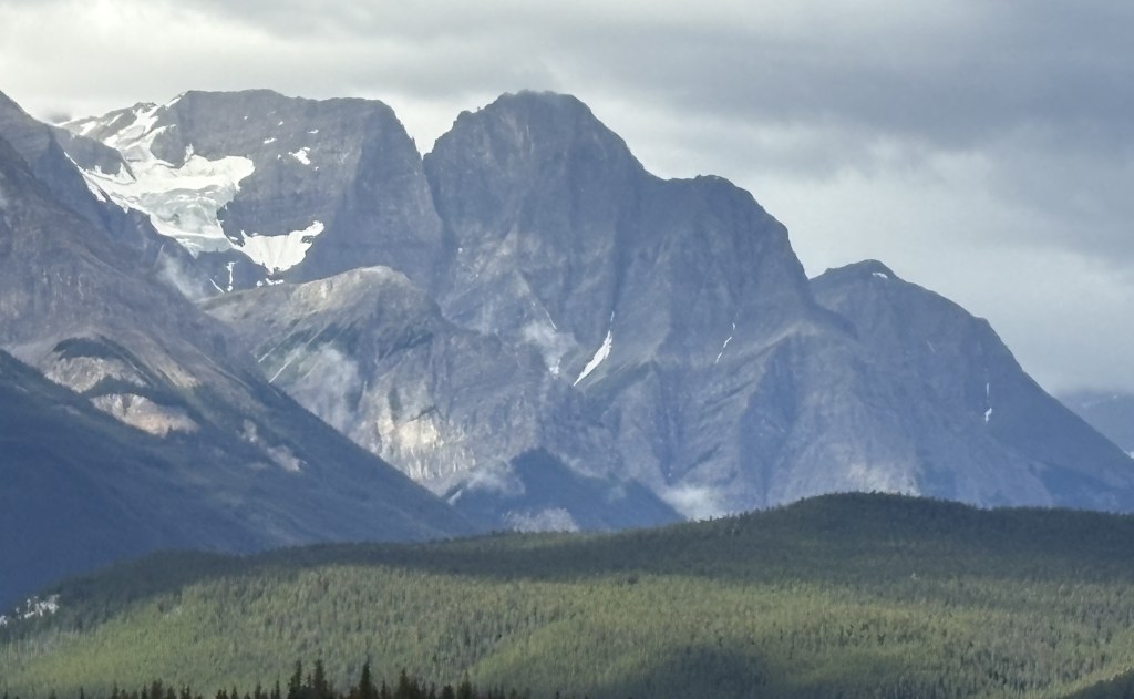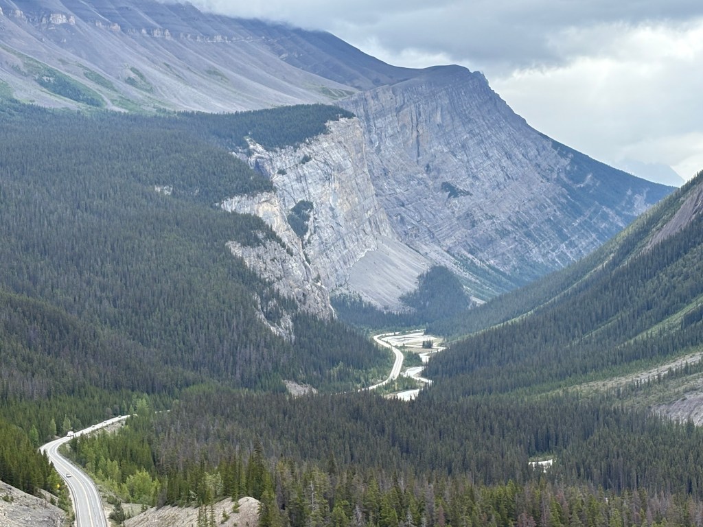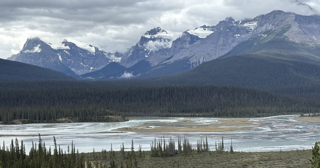 And a wider view looking back. These photos were all taken August 8, about a month ago as I actually post this. As you can see it was an overcast, albeit clear (air-wise) day. I drove through this same area a few days ago in slightly less ideal conditions due to wildfire smoke which is now being thrust into British Columbia and the Candian Rockies from other parts of Canada, and took more photos which, when it comes time to post them, will show a slightly different look.