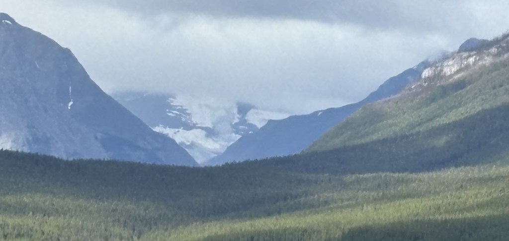 The day started out cloudy, and with some low clouds near the mountains. It was rather cold and windy which made it feel quite raw. Here are some of the many glaciers I saw as I drove north.