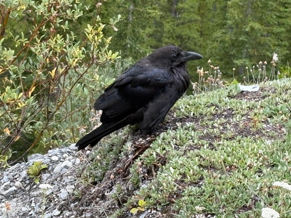 And a big fat crow, sitting on the ground watching all the tourists getting out of their cars and taking photos of the view looking back at the lower elevation we had just come from.