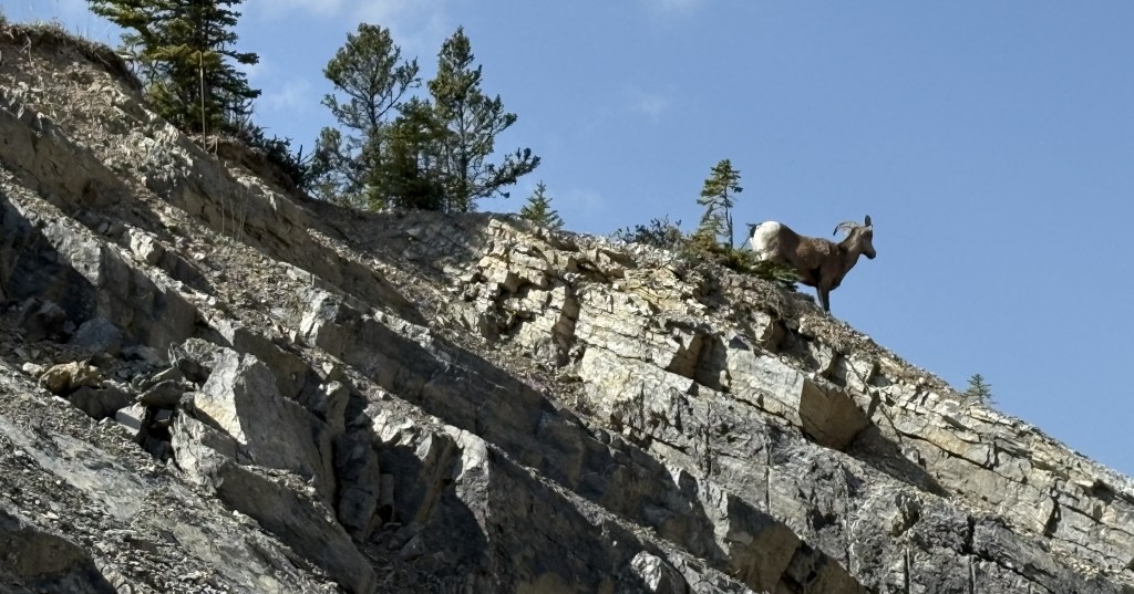 I have the tour bus that was on the road ahead of me to thank for the last two photos. It had pulled off the side of the road to let the passengers take pictures of the bighorn sheep high up on the rocky hill next to the highway. I wouldn’t have seen it otherwise.
