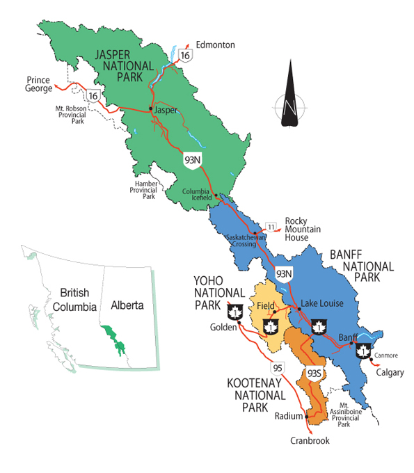 On July 7 I had traveled through Kootenay National Park (brown) and then through part of Banff NP (blue) and Yoho NP (yellow) to get to Golden, where I would be based for 6 nights. The following day I backtracked to Lake Louise and went north towards Jasper National Park (green) and have already posted photos taken in the northern part of Banff NP getting to the point where I crossed into Jasper NP, which is where the Columbia Icefield is located. The entire road (Highway 93N from Lake Louise to the town of Jasper) is called the Icefields Parkway and is considered by many to be among the most scenic roads in Canada.