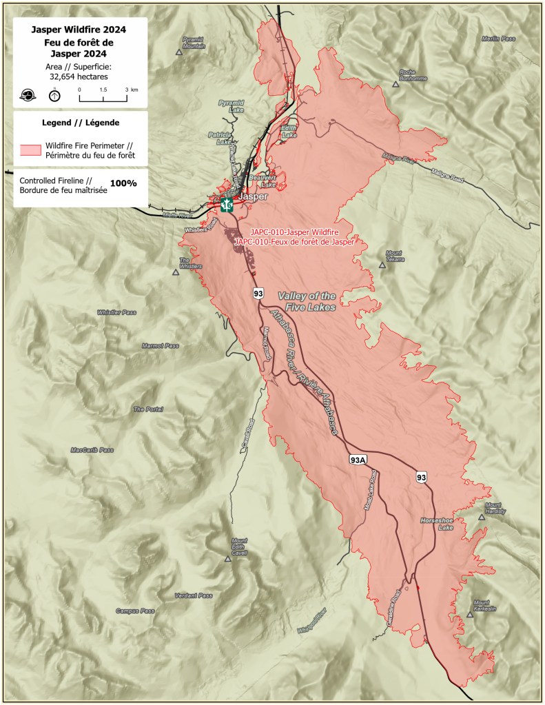 I am now approaching the town of Jasper, AB from the south and have started to see damage caused by the massive wildfire which started a little over a year before I arrived in early August, 2025. You won’t see much evidence of it in my photos but I would be remiss if I didn’t explain what happened.