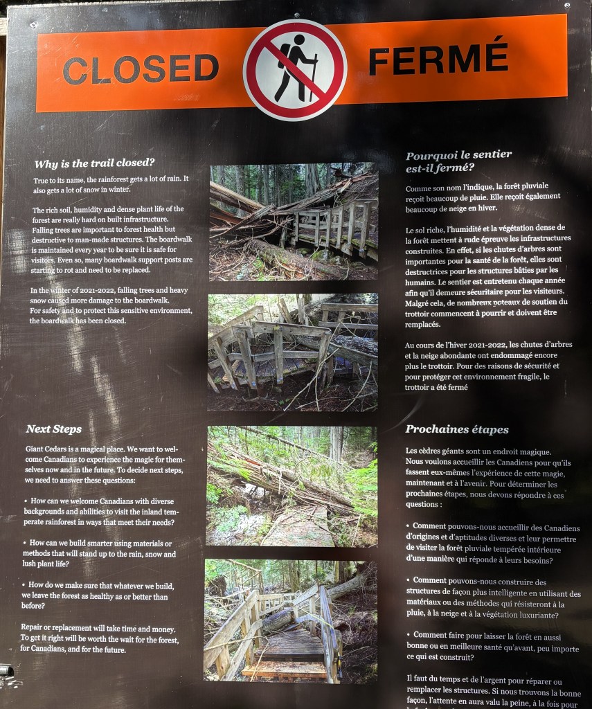 So I drove to the Giant Cedars Boardwalk just up the road, and the lack of vehicles there should have been a clue. It, too, was closed: