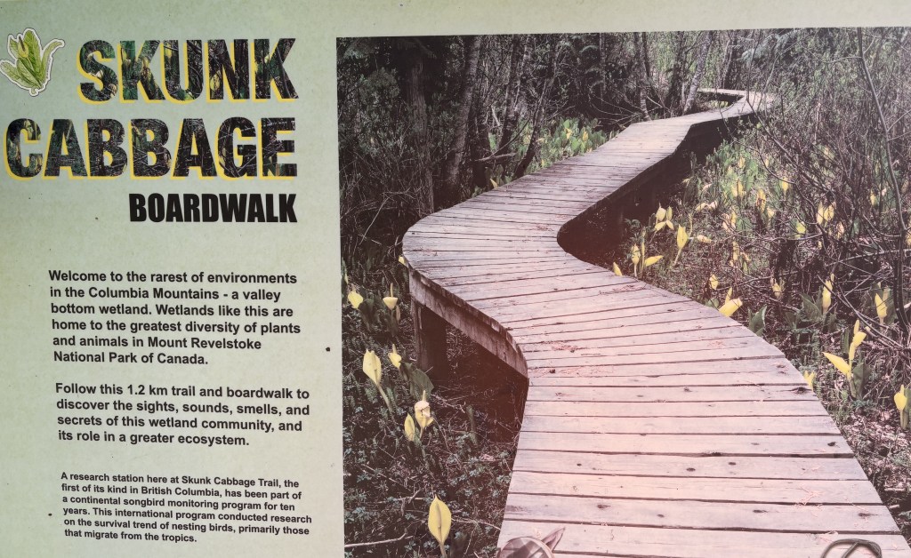 When I got back down I went into town to get something to eat and then started back to Golden, a 2 1/2 hour drive. When I had stopped at the kiosk earlier the ranger had suggested two places I would now pass on my way home. The first was a place called the Skunk Cabbage Boardwalk, a wetlands area next to the Illecillewaet River (the name is pronounced Ill-a-silhouette) and the water flows down from an enormous glacier of the same name in Glacier National Park. It is well south of the highway and not visible from the road.