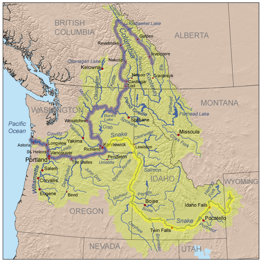 After passing through Golden it continues north past the Columbia Icefields, where it undoubtedly picks up a lot more water, and continues north until it gets near Mica Creek, where it changes direction and starts heading SOUTH. It will then flow past Revelstoke and continue on down to Castlegar (which you will see when I post photos from there later in my trip). It continues south into Washington State, eventually passing through the Coulee Dam, past Wenatchee, WA on down to the border between Washington and Oregon, where it then flows west, forming the Columbia River Gorge, and eventually out into the Pacific Ocean.