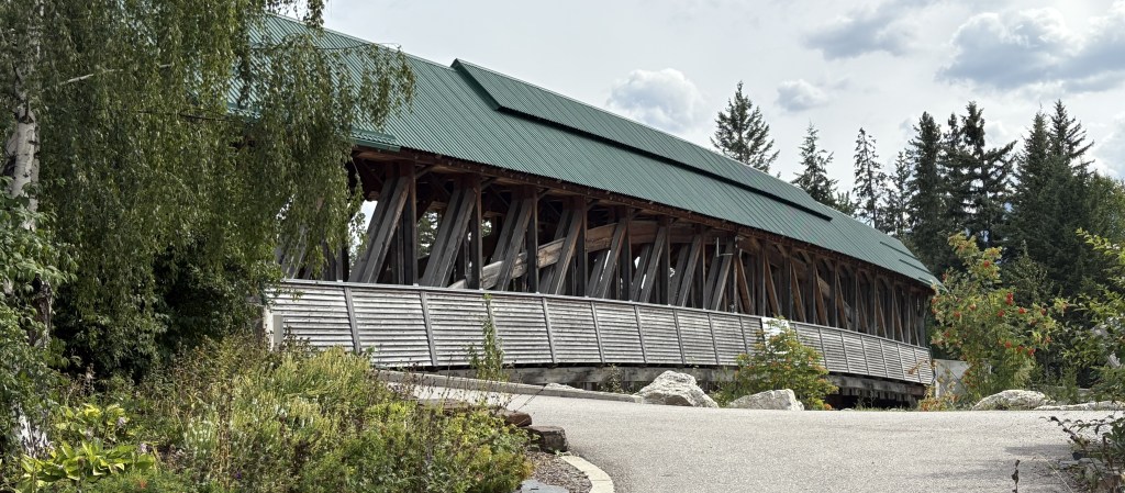 The bridge, the longest freestanding timber-framed bridge in Canada, spans the Kicking Horse River. The Kicking Horse river joins the Columbia River just north of the bridge, near the airport and Confluence Park.