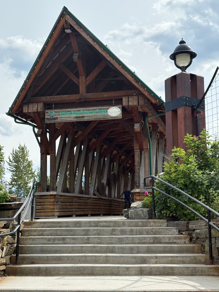 Another place featured in many brochures about Golden is the Kicking Horse pedestrian bridge near downtown. The Kicking Horse name is attached to many things in and around Golden, a river, a mountain, a mountain pass, and the ski area, among others. According to Wikipedia the river got its name in 1858 when a member of the Palliser Expedition was kicked by his packhorse while exploring the river and trying to rescue another horse from it.