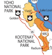 Sorry the map is kind of small but it focuses on the route I would take. From Golden I drove south on Highway 95 to the town of Radium Hot Springs. There I would turn left on Highway 93S which goes through Kootenay National Park and up to the Trans Canada Highway (Hwy 1), which I would take back to Golden. The entire loop is about 200 miles.
