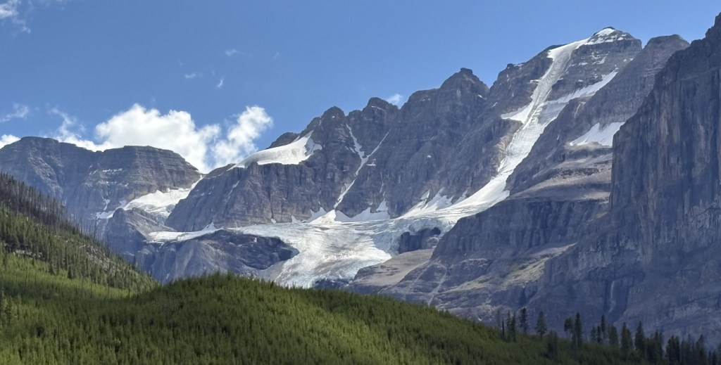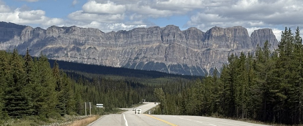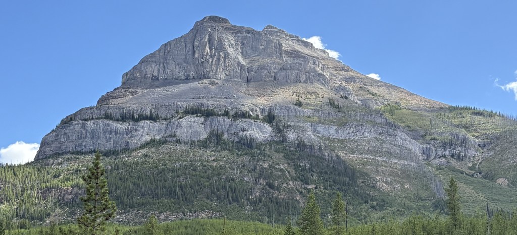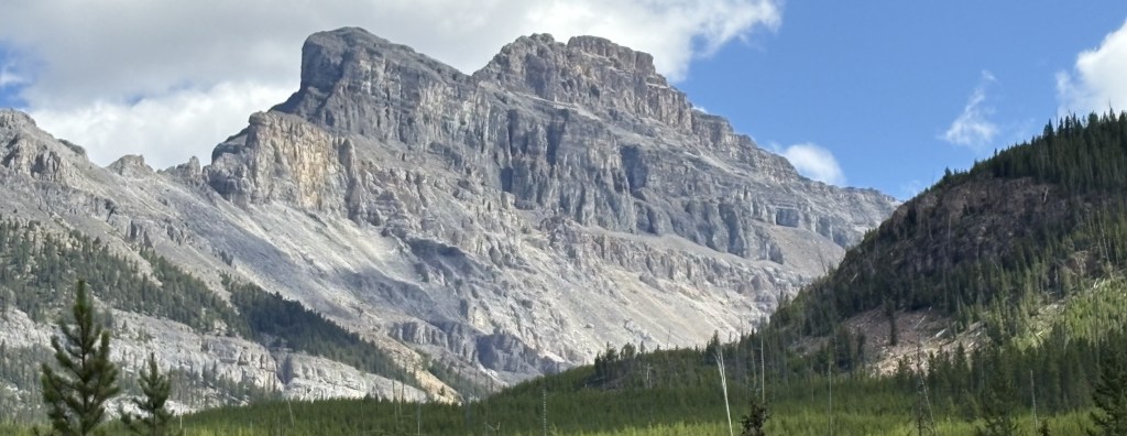 The mountain in the distance (below) is Castle Mountain, which is 9,075 feet tall and is on the opposite side of the Trans Canada Highway (Hwy 1). It is several miles away, and is very imposing as you drive past it on the TCH.