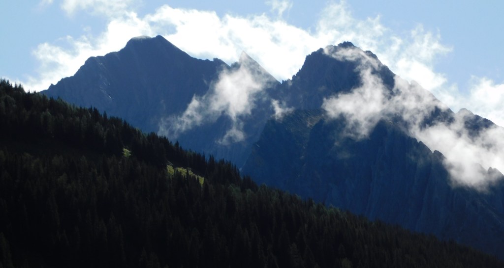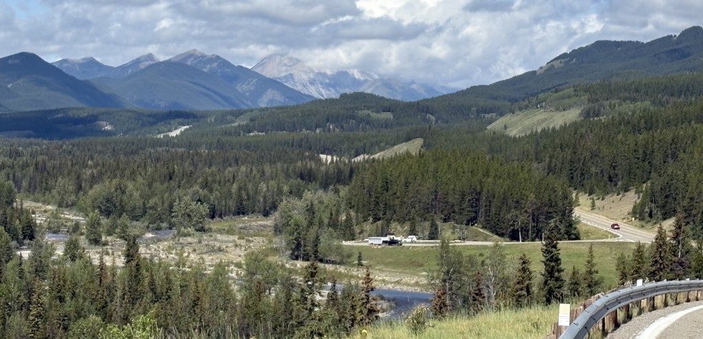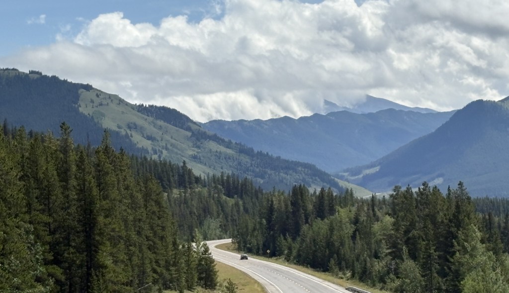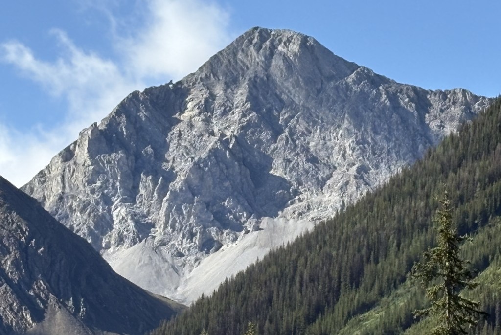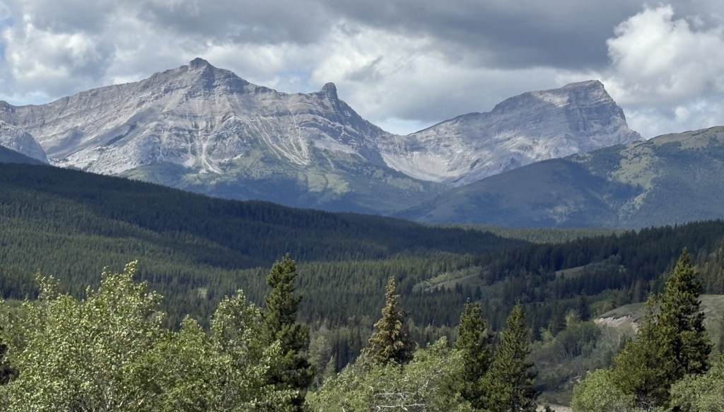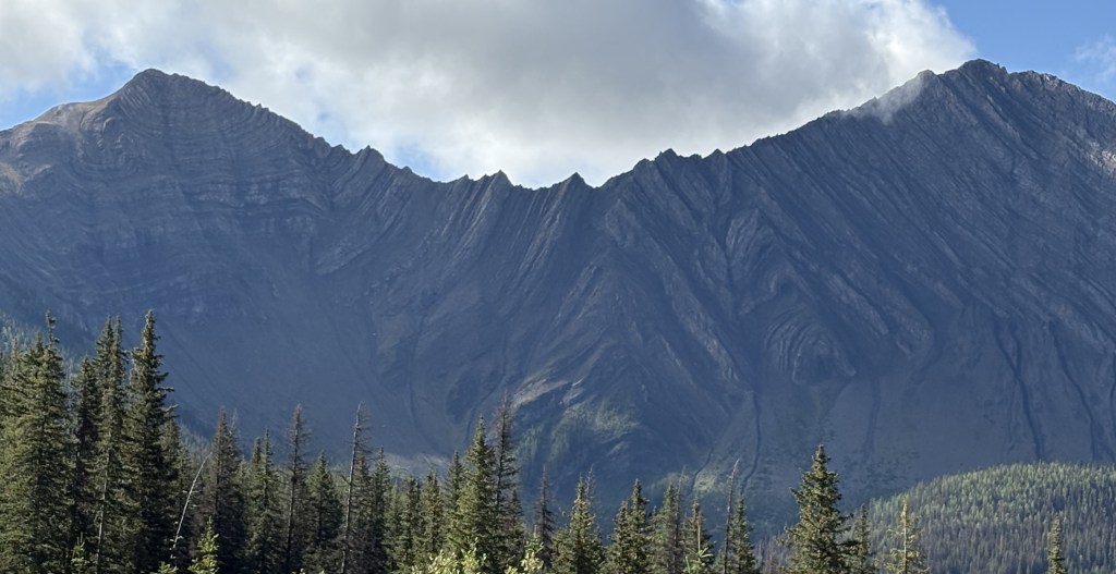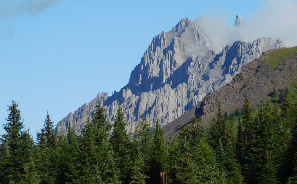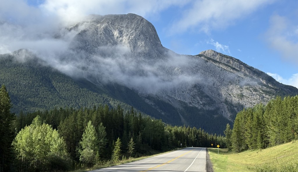 While I was now in the foothills of the Canadian Rockies there were still sizeable mountains along my route. There were some low clouds as I drove south but they would lift later in the day. Once again, many of the mountains were different in appearance than others I have seen Canada.