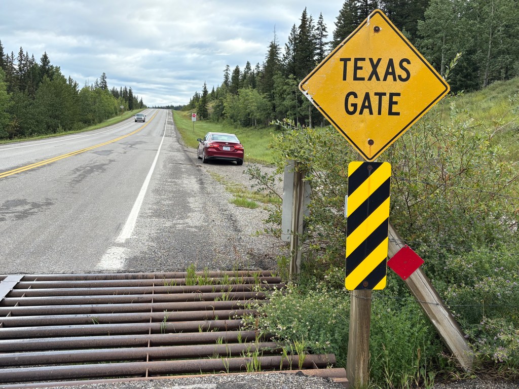 I see them lots of places but hadn’t really noticed them in Canada until now. They keep cattle from leaving areas where farmers or ranchers would like them to stay by creating slots which their hooves would drop into, thereby preventing them from getting by. They are generally accompanied by signs warning drivers of “Free Range” animals ahead. In this case, cattle are allowed to cross the main road to get to fields or pastures on the other side but are prevented from getting too far on the road itself.