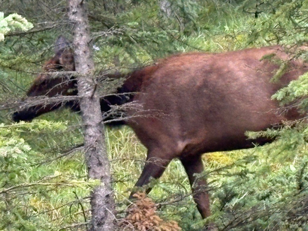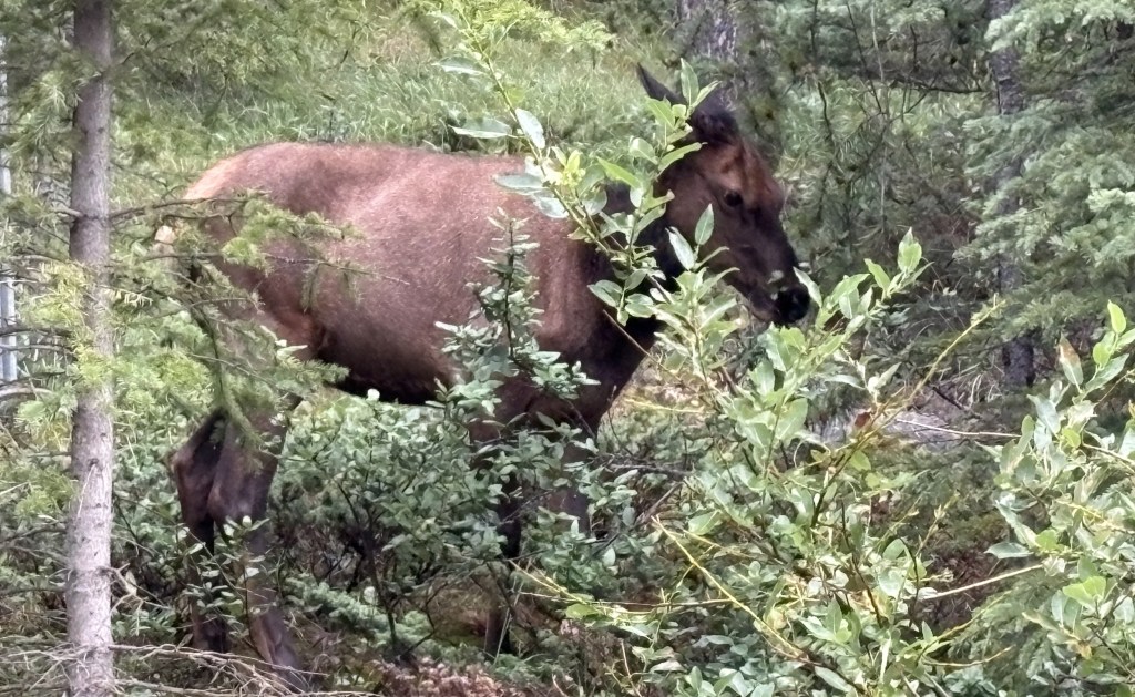 Having done that, today I drove back up to Banff. The rain was still in the area but it was not a washout. Light rain continued off and on all day but I tried to get out and see more of Banff. I drove up high above town to where the Banff Upper Hot Springs are, as well as the Banff Gondola. I could not drive all the way to the Hot Springs because I didn’t have a reservation there. The Gondola was not yet open, and given the cloud cover I wasn’t optimistic that I would see anything from it anyway. As I started driving back down into town I saw a lone cow moose walking along the road. She turned to walk up into the woods but I was able to take some pictures of her.