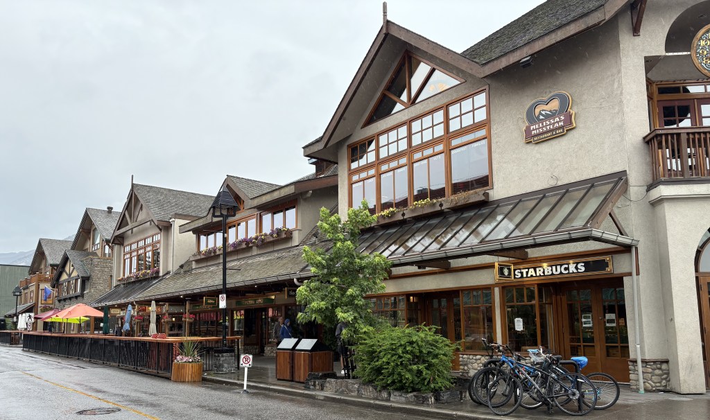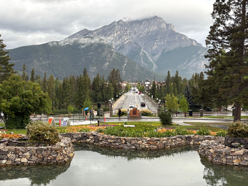 That is the view from the front of the building looking across the bridge over the Bow River and down Banff Avenue, the “main street” of Banff. The mountain in the distance is Tunnel Mountain.