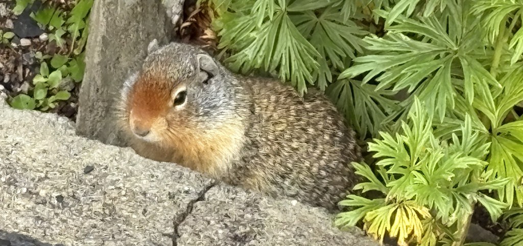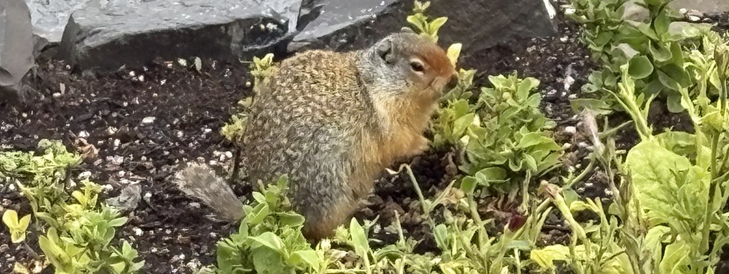 This is yet another marmot. I spotted it as I walked around to the front of the building. I stood very still after he ducked down into a hole near the sidewalk and after a short wait he reappeared.