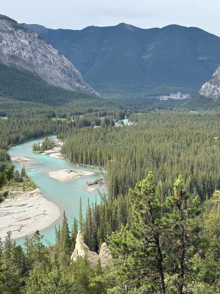 It did make a nice photo, though, with them in the foreground, the Bow River in the center and the Fairmont Banff Springs hotel in the distance.