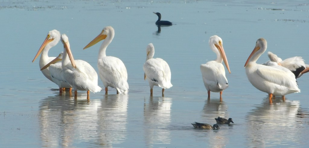 As I approached a lake next to the highway I saw a large white spot down near the water. I turned around and went back, turning in on an access road, and sure enough – it was a large flock of white pelicans, along with cormorants and ducks.