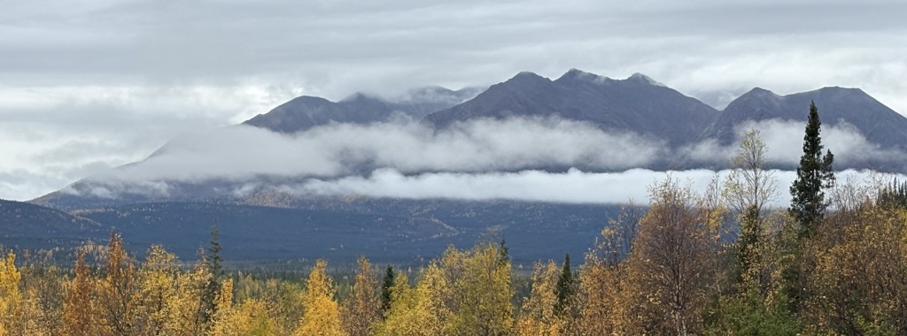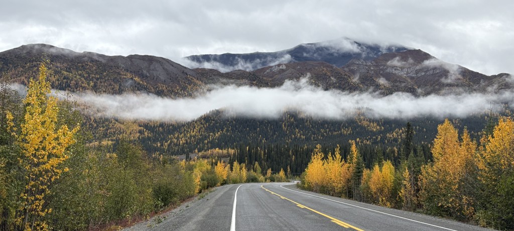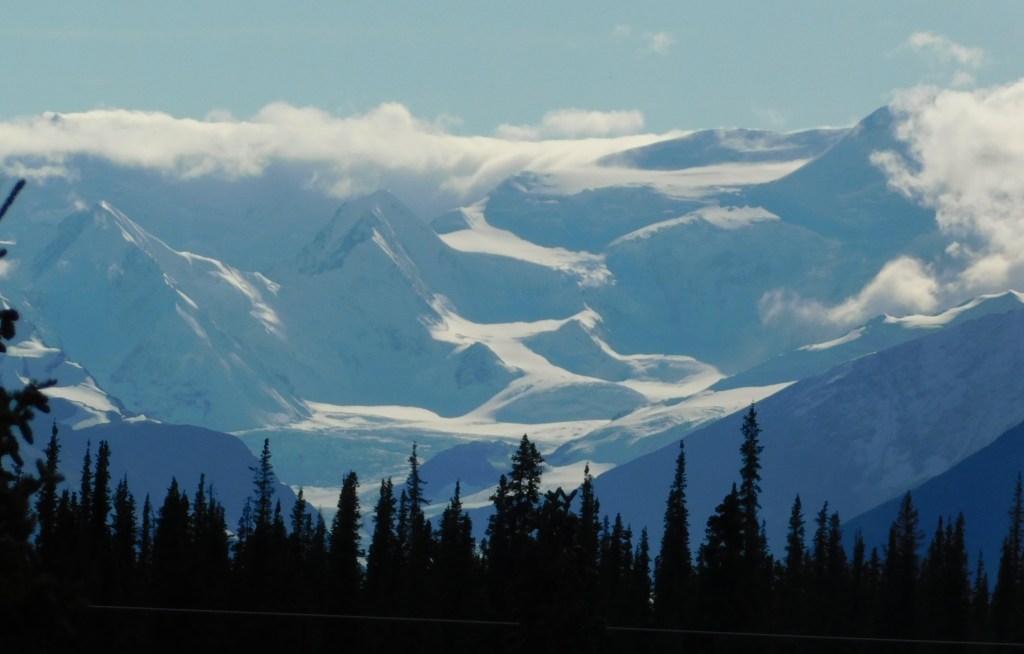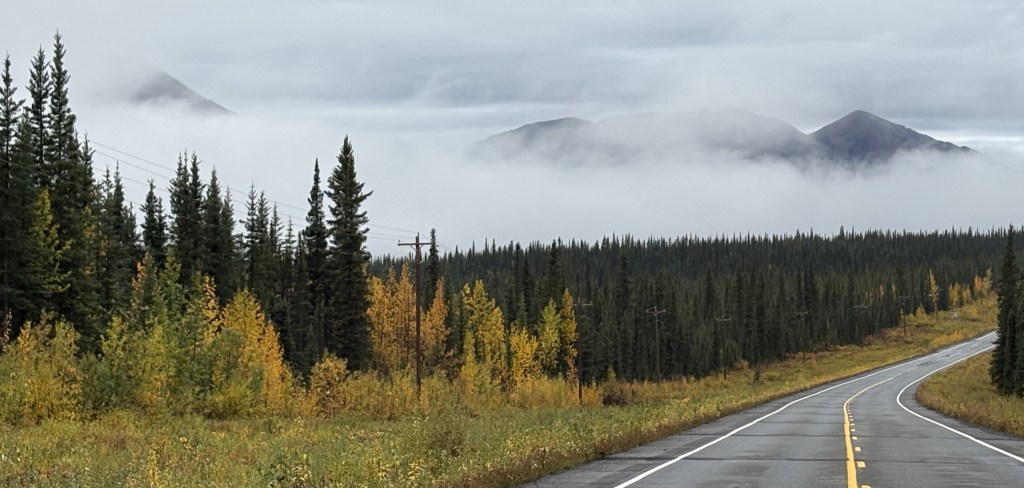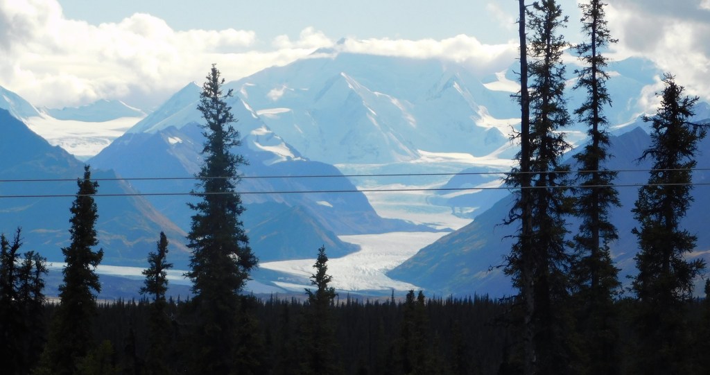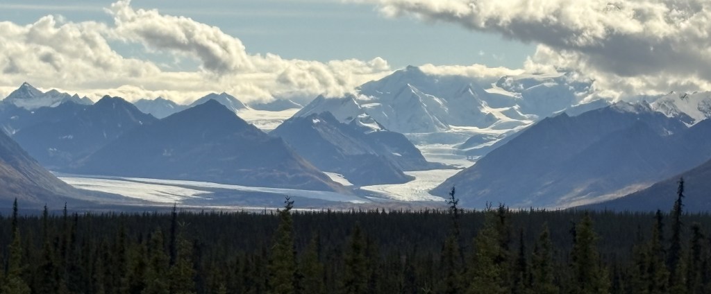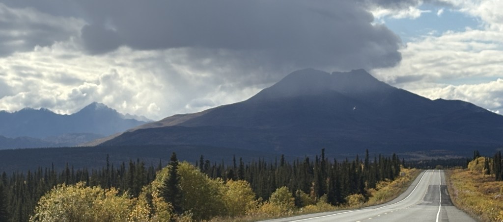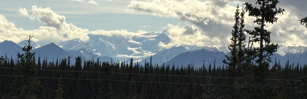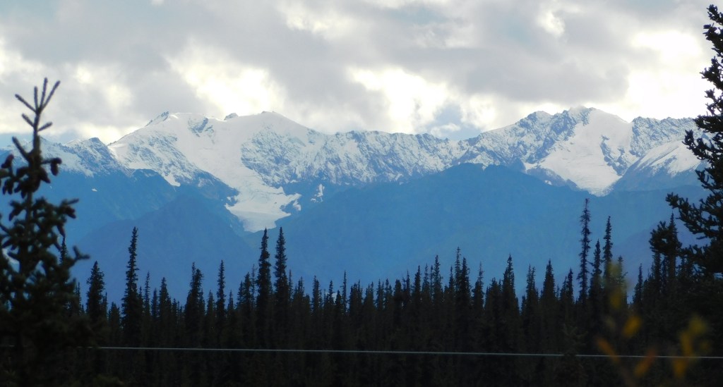 As I travel between Tok upstate and Anchorage near the water, the road would take me on a long open stretch between Glennallen and Palmer. A little short of halfway the road rises to an elevation of about 3,000′ (Tok and Glennallen are at around 1,500′). There was a constant string of mountains to the south and I started to see snow on some of them, and the telltale cloud cover which seems to occur if there is snow or a glacier at high elevation.