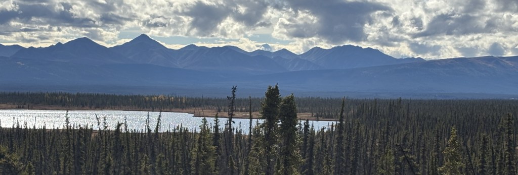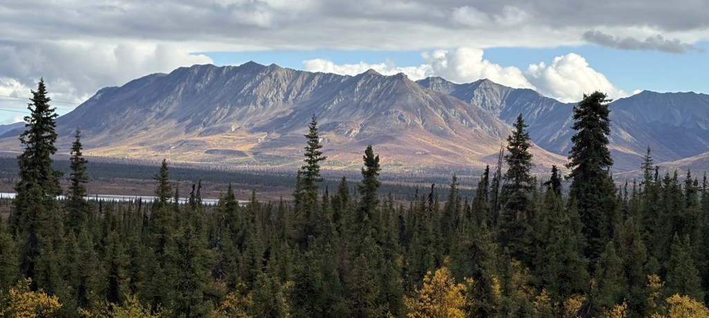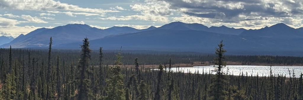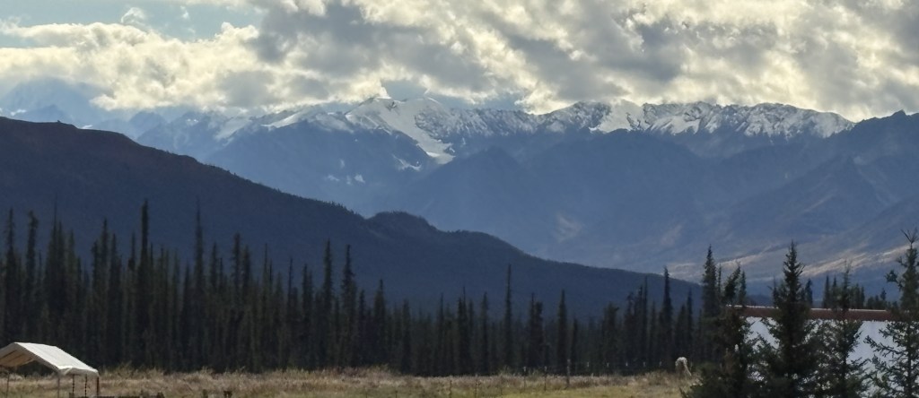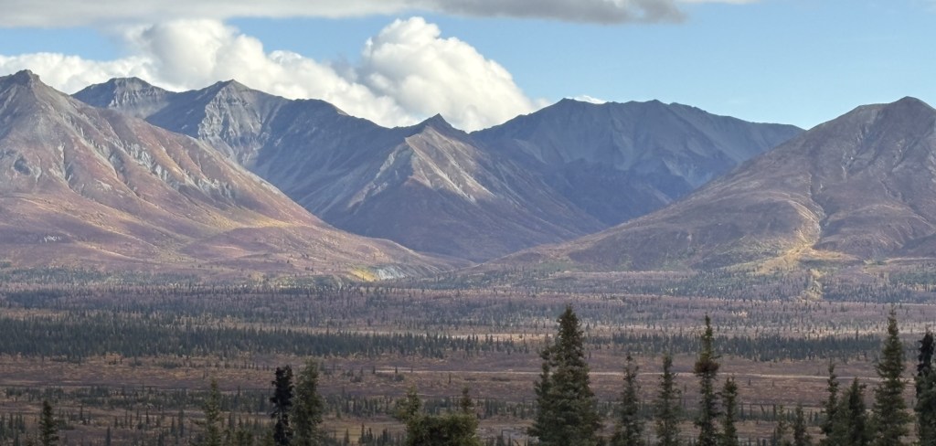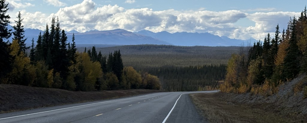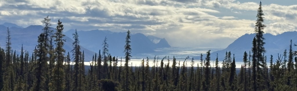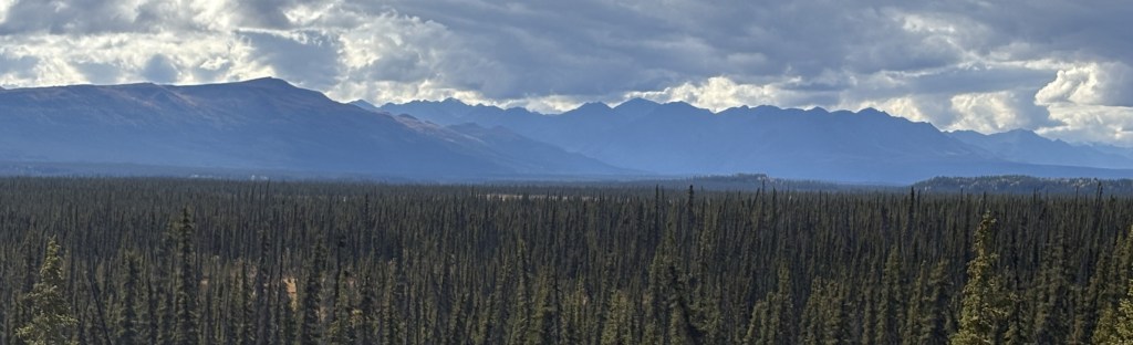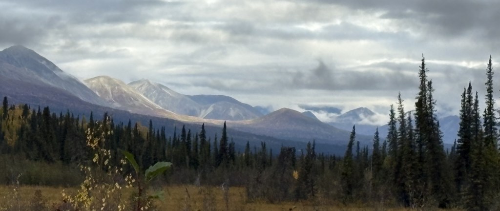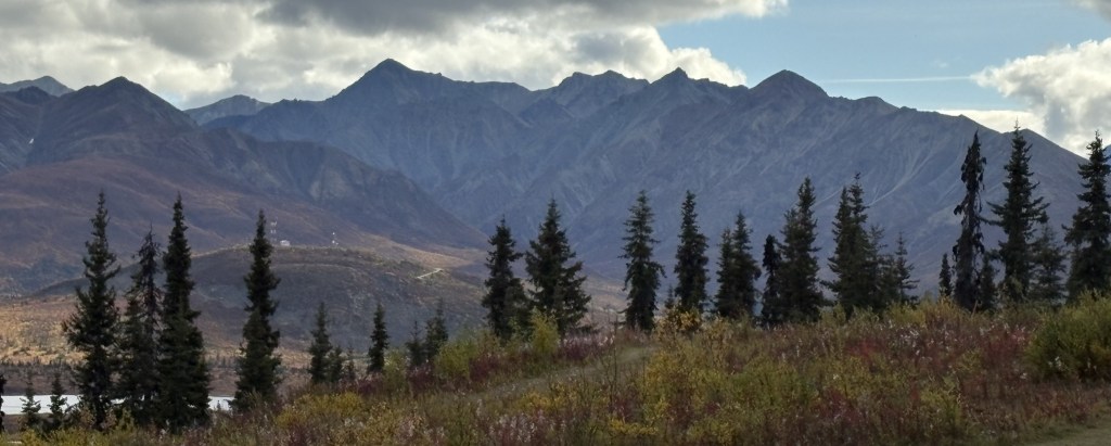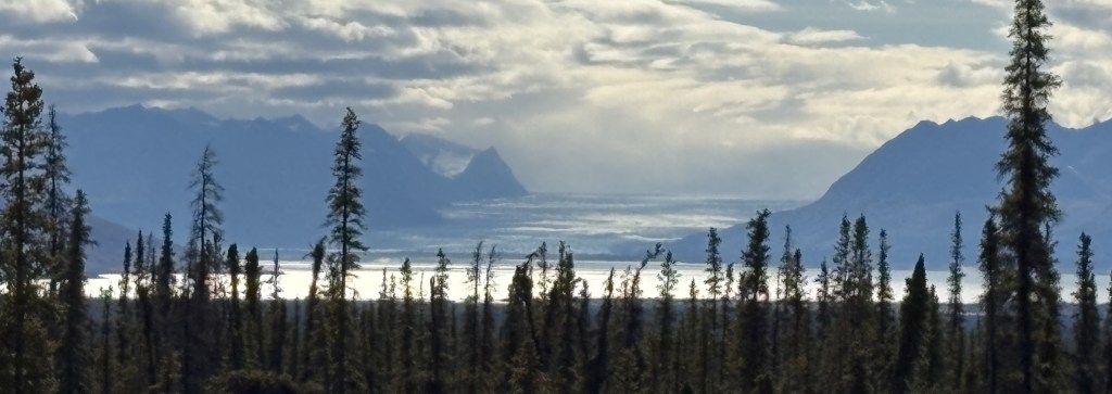As I travel between Tok upstate and Anchorage near the water, the road would take me on a long open stretch between Glennallen and Palmer. A little short of halfway the road rises to an elevation of about 3,000′ (Tok and Glennallen are at around 1,500′). There was a constant string of mountains to the south and I started to see snow on some of them, and the telltale cloud cover which seems to occur if there is snow or a glacier at high elevation.