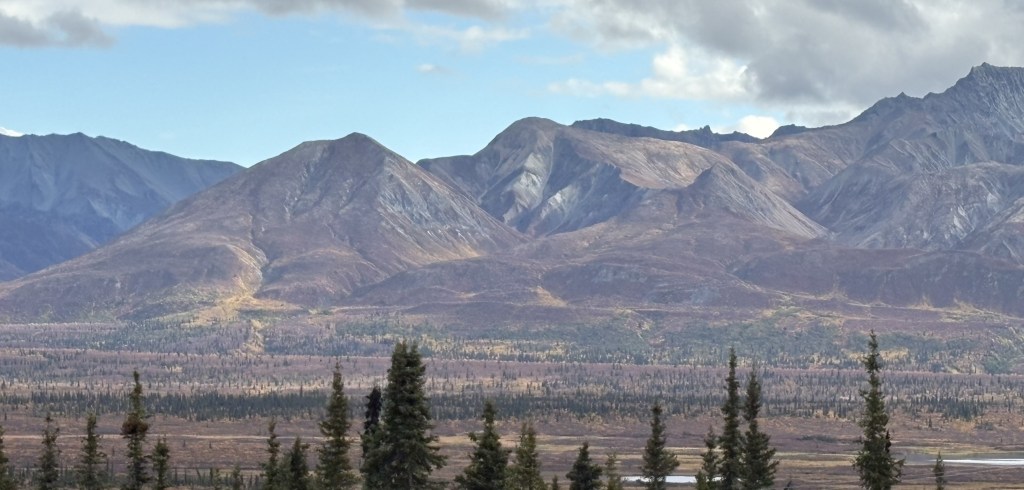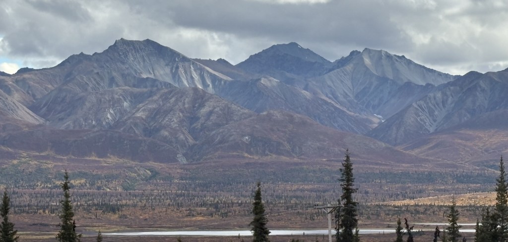 Some of the mountains shown above have a solid coating of snow. And before I had a chance to stop and get to a place to take those photos, I could tell that the clouds on the right hand side were obscuring an even taller peak covered in snow. I believe that tallest mountain is either Mount Witherspoon (12,012 feet elevation) or Mount Marcus Baker (13,176 feet elevation). And each of the peaks in the photo, snow covered or not, are separate mountains in that “small” area. When I got to Anchorage I asked if there was a map showing the locations of all the glaciers along the coast and was shocked to learn that there are over 100,000 glaciers in Alaska and there are no maps to make identification easy.