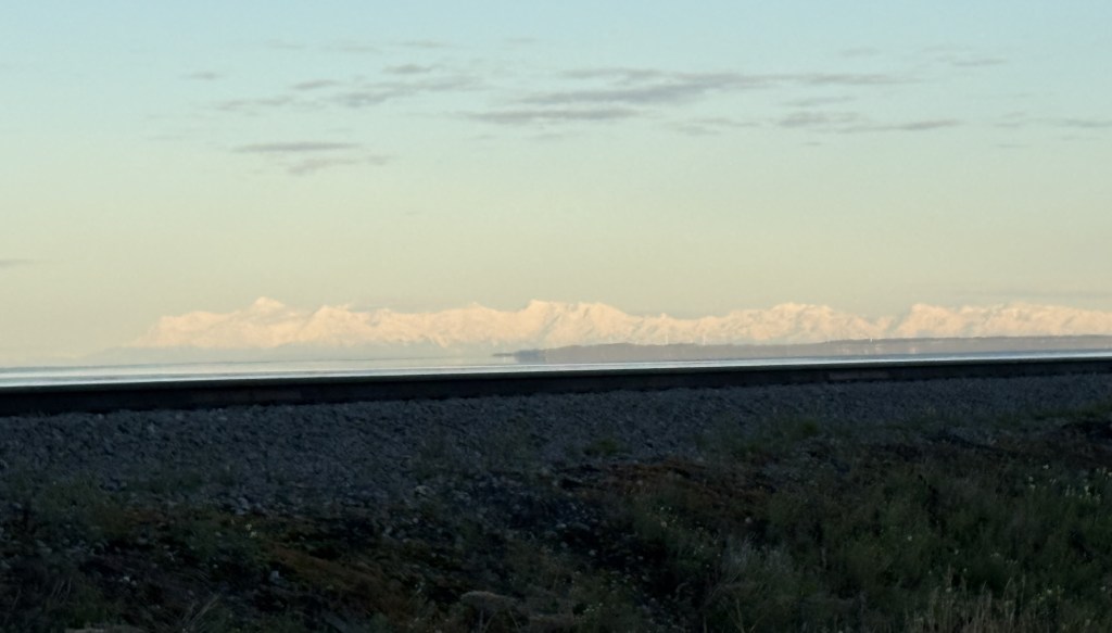 I saw a sign in “Earthquake Park” on the north side of Anchorage where the Denali mountains are sometimes visible on a clear day. A sign there indicated it is 135 air miles away, so I was already over 10 miles further away, and driving there is not a straight shot.
