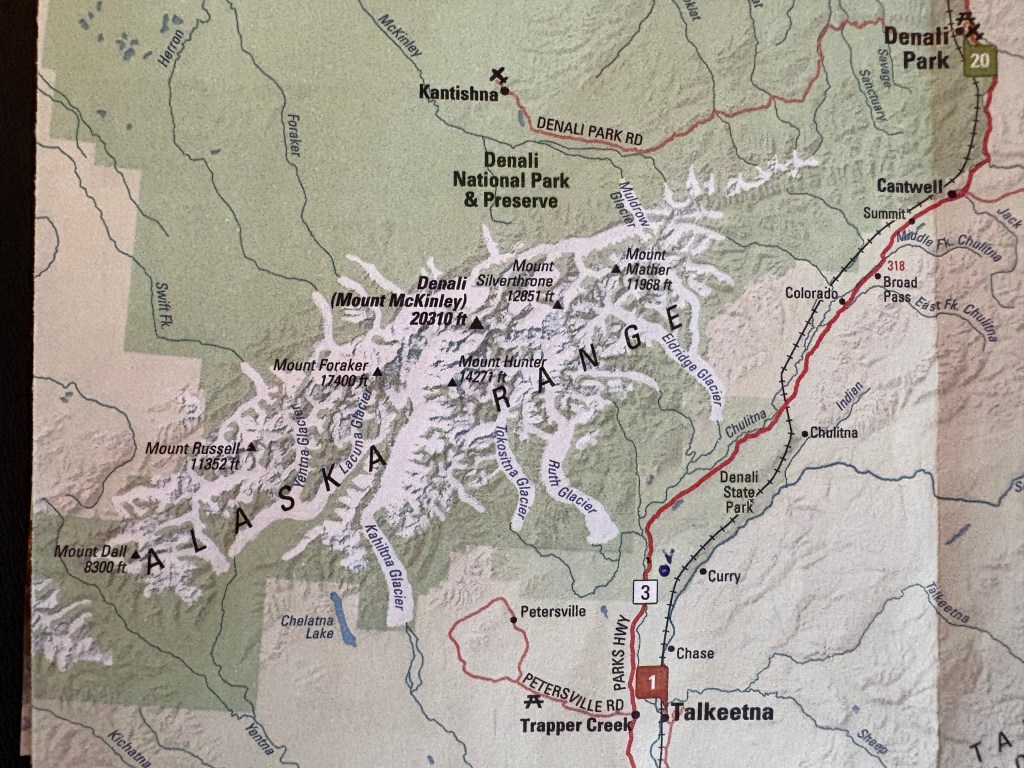 You can see the names of seven of the major mountains. I will only be talking about three in these two posts: Mt. Foraker (Wife), Mt. Hunter (Child) and Mt. Denali (High One). Hunter is harder to find but it is just above the letter ‘R’ in Range, and is closer to the highway than the other two.